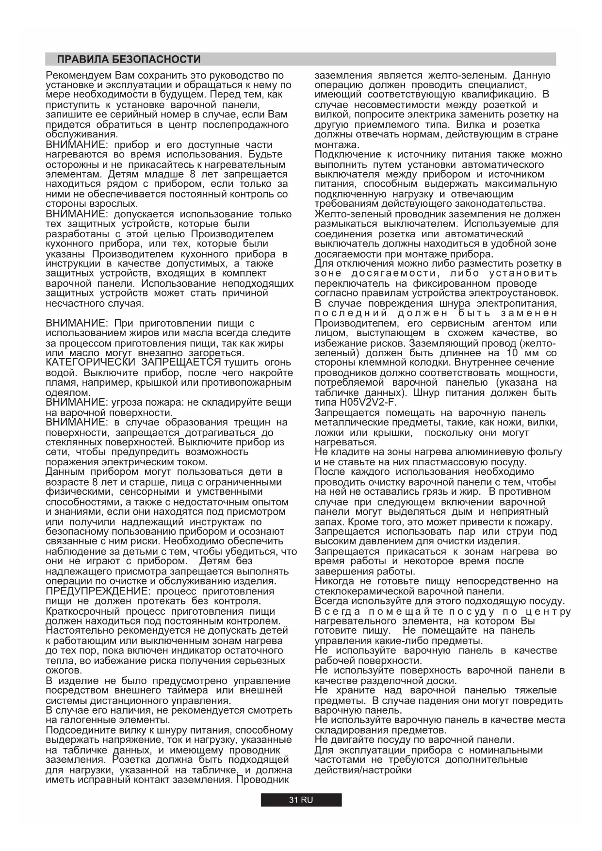 Сечение проводников кабеля питания должно соответствует мощности, потребляемой варочной поверхностью. Если варочная поверхность подключается к электросети напрямую, то должен быть установлен автоматический выключатель. Для предотвращения опасностей замена поврежденного кабеля питания должна выполняться только квалифицированным специалистом. Провод заземления (желто-зеленый) должен быть приблизительно на 10 мм длиннее проводов фазы и нейтрали. Перед подключением варочной поверхности к электросети проверьте систему заземления. Проверьте данные, приведенные в паспортной табличке, закрепленной снаружи на варочной поверхности, для того, чтобы убедиться в том, что входное напряжение варочной поверхности соответствует напряжению электросети. 32 RU