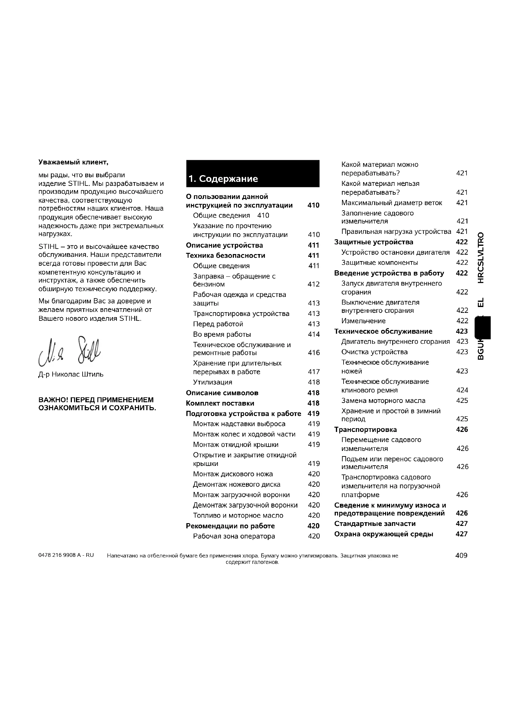О пользовании данной инструкцией по эксплуатации 410 Общие сведения 410 Указание по прочтению инструкции по эксплуатации 410 Описание устройства 411 Техника безопасности 411 Общие сведения 411 Заправка – обращение с бензином 412 Рабочая одежда и средства защиты 413 Транспортировка устройства 413 Перед работой 413 Во время работы 414 Техническое обслуживание и ремонтные работы 416 Хранение при длительных перерывах в работе 417 Утилизация 418 Описание символов 418 Комплект поставки 418 Подготовка устройства к работе 419 Монтаж надставки выброса 419 Монтаж колес и ходовой части 419 Монтаж откидной крышки 419 Открытие и закрытие откидной крышки 419 Монтаж дискового ножа 420 Демонтаж ножевого диска 420 Монтаж загрузочной воронки 420 Демонтаж загрузочной воронки 420 Топливо и моторное масло 420 Рекомендации по работе 420 Рабочая зона оператора 420 Какой материал можно перерабатывать?421 Какой материал нельзя перерабатывать?421 Максимальный диаметр веток 421 Заполнение садового измельчителя 421 Правильная нагрузка устройства 421 Защитные устройства 422 Устройство остановки двигателя 422 Защитные компоненты 422 Введение устройства в работу 422 Запуск двигателя внутреннего сгорания 422 Выключение двигателя внутреннего сгорания 422 Измельчение 422 Техническое обслуживание 423 Двигатель внутреннего сгорания 423 Очистка устройства 423 Техническое обслуживание ножей 423 Техническое обслуживание клинового ремня 424 Замена моторного масла 425 Хранение и простой в зимний период 425 Транспортировка 426 Перемещение садового измельчителя 426 Подъем или перенос садового измельчителя 426 Транспортировка садового измельчителя на погрузочной платформе 426 Сведение к минимуму износа и предотвращение повреждений 426 Стандартные запчасти 427 Охрана окружающей среды 4270478 216 9908 A - RU