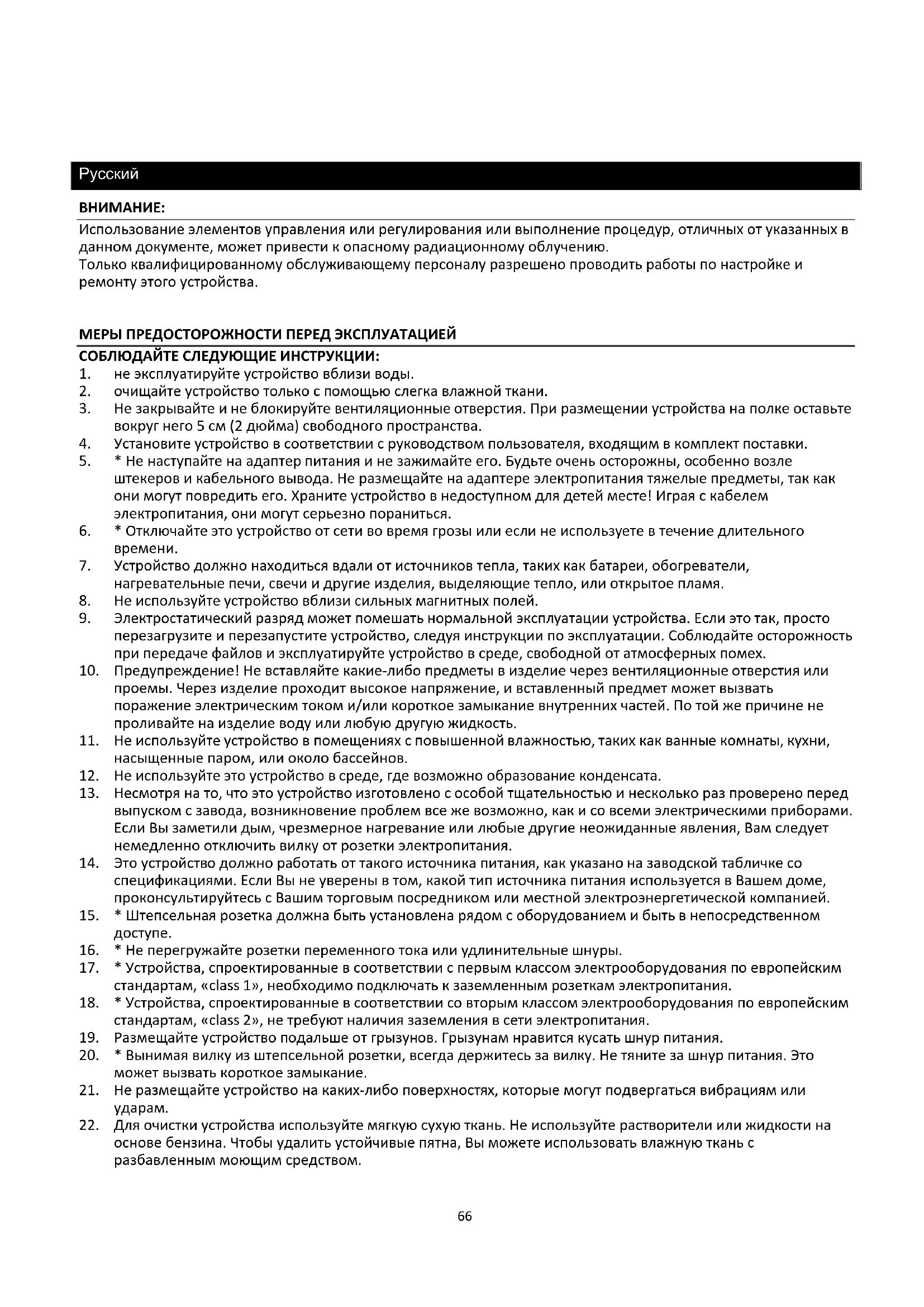 Использование элементов управления или регулирования или выполнение процедур, отличных от указанных в данном документе, может привести к опасному радиационному облучению. Только квалифицированному обслуживающему персоналу разрешено проводить работы по настройке и ремонту этого устройства. МЕРЫ ПРЕДОСТОРОЖНОСТИ ПЕРЕД ЭКСПЛУАТАЦИЕЙ СОБЛЮДАЙТЕ СЛЕДУЮЩИЕ ИНСТРУКЦИИ: