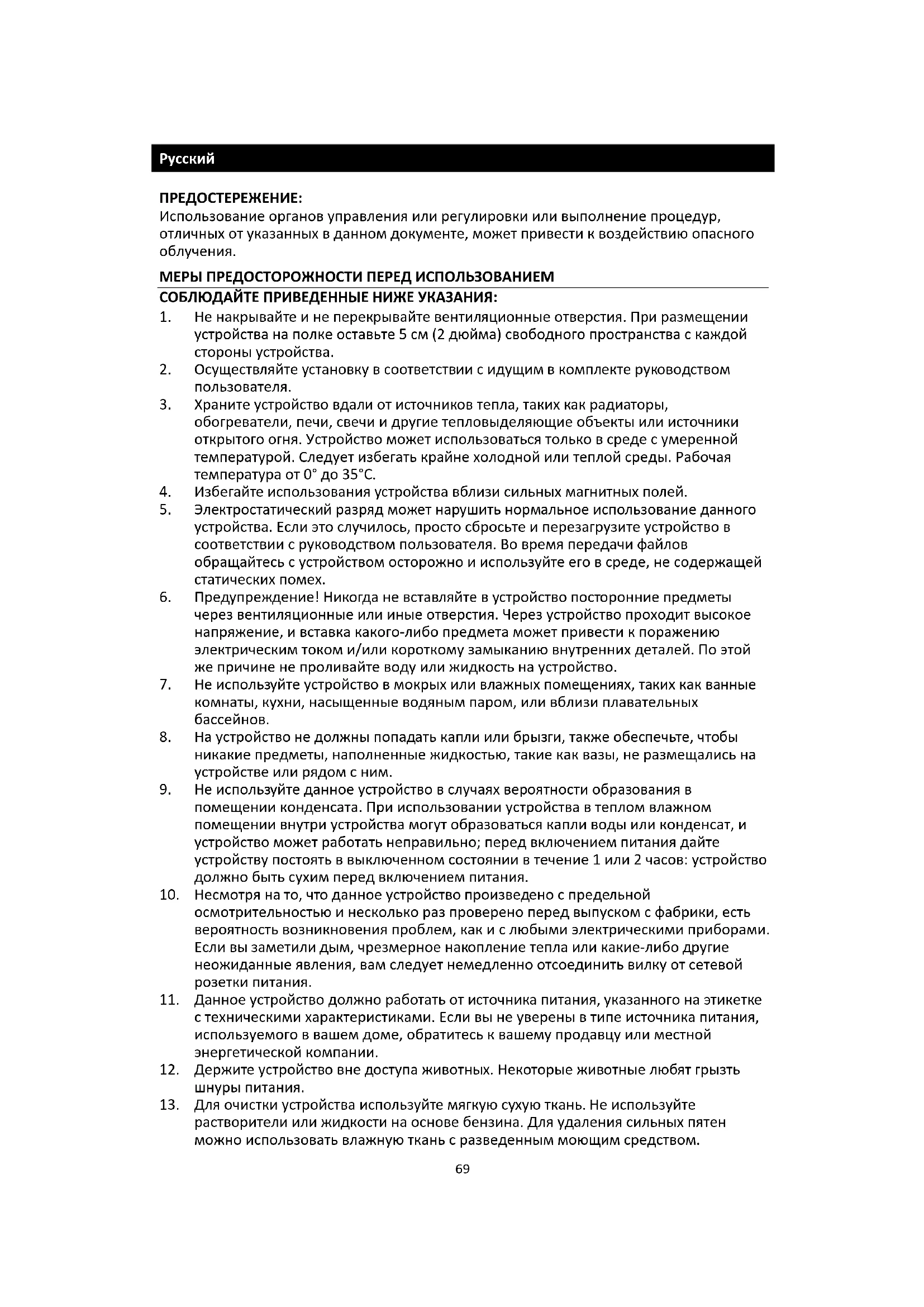 13. Для очистки устройства используйте мягкую сухую ткань. Не используйте