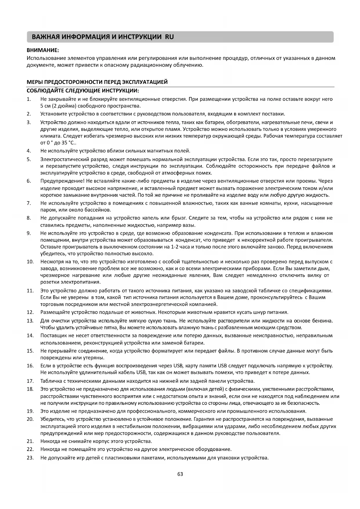 23. Не допускайте игр детей с пластиковыми пакетами, используемыми для упаковки устройства.