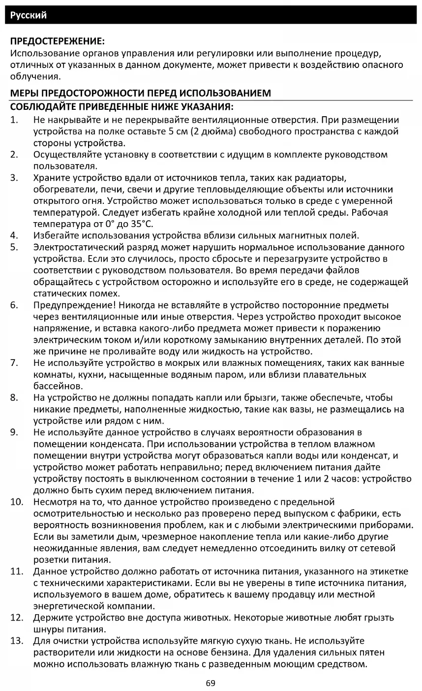 13. Для очистки устройства используйте мягкую сухую ткань. Не используйте