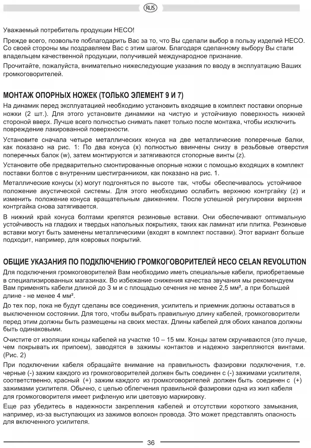 Konguration: 2 vägs basreex 2 vägs basreex Max belastning: 100 / 160 W 100 / 180 W Impedans: 4 – 8 ohm 4 – 8 ohm Frekvensområde: 30 – 52 000 Hz 30 – 52 000 Hz Rekommenderad förstärkareffekt: 30 – 160 W 30 – 180 W Verkningsgrad (1 W/1 m): 90 dB 90 dB Mått (BxHxD): 240 x 420 x 360 mm 598 x 212 x 360 mm Tillbehör: Hårdgummi-spikes Hårdgummi-spikes VI FÖRBEHÅLLER OSS RÄTTEN TILL TEKNISKA ÄNDRINGAR.36 Уважаемый потребитель продукции HECO! Прежде всего, позвольте поблагодарить Вас за то, что Вы сделали выбор в пользу изделий HECO. Со своей стороны мы поздравляем Вас с этим шагом. Благодаря сделанному выбору Вы стали владельцем качественной продукции, получившей международное признание. Прочитайте, пожалуйста, внимательно нижеследующие указания по вводу в эксплуатацию Ваших громкоговорителей. МОНТАЖ ОПОРНЫХ НОЖЕК (ТОЛЬКО ЭЛЕМЕНТ 9 И 7) На динамик перед эксплуатацией необходимо установить входящие в комплект поставки опорные ножки (2 шт.). Для этого установите динамики на чистую и устойчивую поверхность нижней стороной вверх. Лучше всего полностью снимать пакет только после монтажа, чтобы исключить повреждение лакированной поверхности. Установите сначала четыре металлических конуса на две металлические поперечные балки, как показано на рис. 1: По два конуса (x) полностью ввинчены снизу в резьбовые отверстия поперечных балок (w), затем монтируются и затягиваются стопорные винты (z). Установите обе предварительно смонтированные опорные ножки с помощью входящих в комплект поставки болтов с внутренним шестигранником, как показано на рис. 1. Металлические конусы (x) могут подгоняться по высоте так, чтобы обеспечивалось устойчивое положение акустической системы. Для этого необходимо ослабить верхнюю контргайку (z) и изменить положение конуса вращательным движением. После успешной регулировки верхняя контргайка снова затягивается. В нижний край конуса болтами крепятся резиновые вставки. Они обеспечивают оптимальную устойчивость на гладких и твердых напольных покрытиях, таких как ламинат или плитка. Резиновые вставки могут быть заменены металлическими (входят в комплект поставки). Этот вариант больше подходит, например, для ковровых покрытий.
