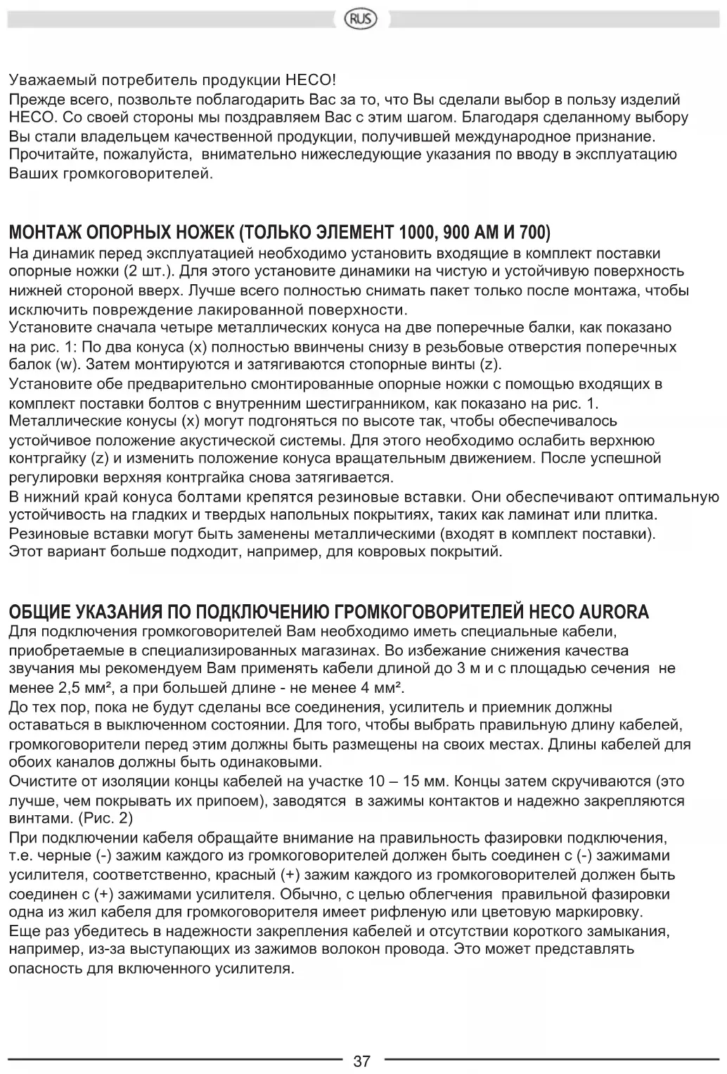 Konfiguration: 2 vägs basreflex 2 vägs basreflex Max belastning: 65 / 120 W 90 / 150 W Impedans: 4 – 8 ohm 4 – 8 ohm Frekvensområde: 38 – 42 500 Hz 34– 42 500 Hz Rekommenderad förstärkareffekt: 20 – 150 W 20 – 150 W Verkningsgrad (2.8V/1m): 89 dB 90 dB Mått (BxHxD): 170 x 308 x 245 mm 490 x 177 x 303 mm Tillbehör: Hårdgummi-spikes Hårdgummi-spikes VI FÖRBEHÅLLER OSS RÄTTEN TILL TEKNISKA ÄNDRINGAR.Уважаемый потребитель продукции HECO! Прежде всего, позвольте поблагодарить Вас за то, что Вы сделали выбор в пользу изделий HECO. Со своей стороны мы поздравляем Вас с этим шагом. Благодаря сделанному выбору Вы стали владельцем качественной продукции, получившей международное признание. Прочитайте, пожалуйста, внимательно нижеследующие указания по вводу в эксплуатацию Ваших громкоговорителей. МОНТАЖ ОПОРНЫХ НОЖЕК (ТОЛЬКО ЭЛЕМЕНТ 1000, 900 AM И 700) На динамик перед эксплуатацией необходимо установить входящие в комплект поставки опорные ножки (2 шт.). Для этого установите динамики на чистую и устойчивую поверхность нижней стороной вверх. Лучше всего полностью снимать пакет только после монтажа, чтобы исключить повреждение лакированной поверхности. Установите сначала четыре металлических конуса на две поперечные балки, как показано на рис. 1: По два конуса (x) полностью ввинчены снизу в резьбовые отверстия поперечных балок (w). Затем монтируются и затягиваются стопорные винты (z). Установите обе предварительно смонтированные опорные ножки с помощью входящих в комплект поставки болтов с внутренним шестигранником, как показано на рис. 1. Металлические конусы (x) могут подгоняться по высоте так, чтобы обеспечивалось устойчивое положение акустической системы. Для этого необходимо ослабить верхнюю контргайку (z) и изменить положение конуса вращательным движением. После успешной регулировки верхняя контргайка снова затягивается. В нижний край конуса болтами крепятся резиновые вставки. Они обеспечивают оптимальную устойчивость на гладких и твердых напольных покрытиях, таких как ламинат или плитка. Резиновые вставки могут быть заменены металлическими (входят в комплект поставки). Этот вариант больше подходит, например, для ковровых покрытий. ОБЩИЕ УКАЗАНИЯ ПО ПОДКЛЮЧЕНИЮ ГРОМКОГОВОРИТЕЛЕЙ HECO AURORA Для подключения громкоговорителей Вам необходимо иметь специальные кабели, приобретаемые в специализированных магазинах. Во избежание снижения качества звучания мы рекомендуем Вам применять кабели длиной до 3 м и с площадью сечения не менее 2,5 мм², а при большей длине - не менее 4 мм². До тех пор, пока не будут сделаны все соединения, усилитель и приемник должны оставаться в выключенном состоянии. Для того, чтобы выбрать правильную длину кабелей, громкоговорители перед этим должны быть размещены на своих местах. Длины кабелей для обоих каналов должны быть одинаковыми. Очистите от изоляции концы кабелей на участке 10 – 15 мм. Концы затем скручиваются (это лучше, чем покрывать их припоем), заводятся в зажимы контактов и надежно закрепляются винтами. (Рис. 2) При подключении кабеля обращайте внимание на правильность фазировки подключения, т.е. черные (-) зажим каждого из громкоговорителей должен быть соединен с (-) зажимами усилителя, соответственно, красный (+) зажим каждого из громкоговорителей должен быть соединен с (+) зажимами усилителя. Обычно, с целью облегчения правильной фазировки одна из жил кабеля для громкоговорителя имеет рифленую или цветовую маркировку. Еще раз убедитесь в надежности закрепления кабелей и о