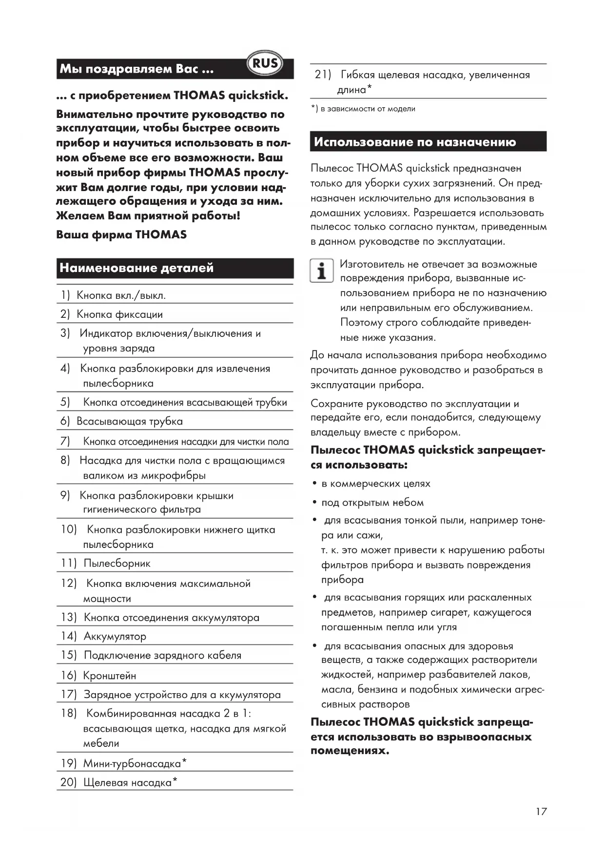 *) в зависимости от модели Использование по назначению Пылесос THOMAS quickstick предназначен только для уборки сухих загрязнений. Он пред- назначен исключительно для использования в домашних условиях. Разрешается использовать пылесос только согласно пунктам, приведенным в данном руководстве по эксплуатации. Изготовитель не отвечает за возможные повреждения прибора, вызванные ис- пользованием прибора не по назначению или неправильным его обслуживанием. Поэтому строго соблюдайте приведен- ные ниже указания. До начала использования прибора необходимо прочитать данное руководство и разобраться в эксплуатации прибора. Сохраните руководство по эксплуатации и передайте его, если понадобится, следующему владельцу вместе с прибором. Пылесос THOMAS quickstick запрещает- ся использовать: