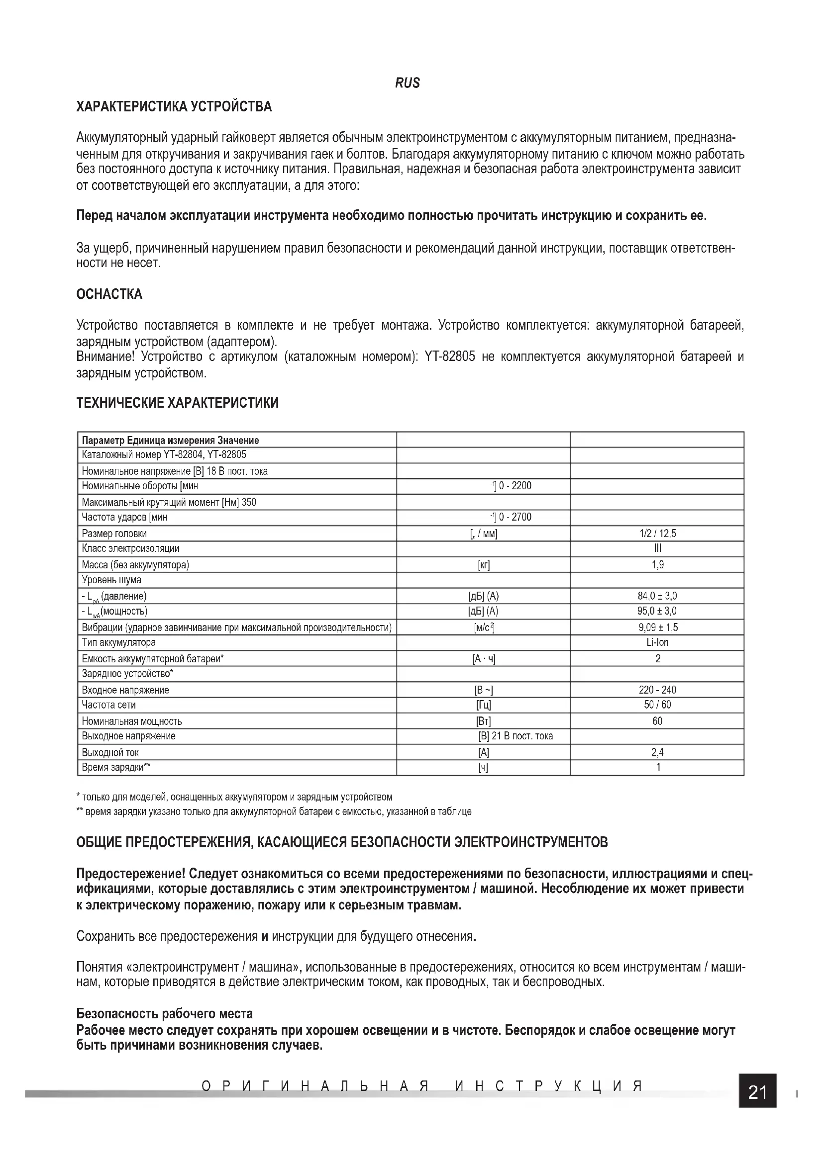Ремонтируй электроинструмент / машину только в учреждениях, имеющих на это служебные права, которые при- меняют только оригинальные запчасти. Обеспечь эту соответствующую безопасность работы электроинструмента. ДОПОЛНИТЕЛЬНЫЕ ИНСТРУКЦИИ ПО БЕЗОПАСНОСТИ Во время эксплуатации инструмента необходимо соблюдать указания по безопасности, содержащиеся в инструкции по эксплуатации, а также другие указания по технике безопасности. Запрещается подвергать инструменты воздействию атмосферных осадков. Перед началом работы требуется убедиться, что используемые насадки не повреждены. В случае наличия каких-либо повреждений, насадки необходимо заменить на новые, без повреждений. Применяемые торцевые ключи и другие сменные инструменты должны быть адаптированы для работы с ударными ин- струментами. Входящие в комплект сменные инструменты должны быть исправными, чистыми и без повреждений, а их размер должен соответствовать размеру головки. Запрещается переделывать торцевые ключи или головку. При работе необходимо использовать защитные очки, также рекомендуется носить перчатки и защитную одежду. Во время работы гайковерт всегда необходимо держать обеими руками. ПОДГОТОВКА К РАБОТЕ ВНИМАНИЕ! Все работы, описанные в этом разделе, следует проводить, отключив устройство от источника питания – обязательно отключить аккумулятор от устройства! Инструкции по безопасной зарядке аккумулятора Внимание! Перед началом зарядки необходимо убедиться, что корпус блока питания, шнур и штепсельная вилка не имеют трещин или повреждений. Запрещается использовать неисправную либо поврежденную зарядную станцию или блок питания! Для зарядки аккумулятора можно использовать только зарядную станцию и блок питания из комплекта ак- кумулятора. Использование любого другого блока питания может привести к возгоранию или повреждению инструмента. Зарядка аккумулятора может осуществляться только в закрытом, сухом помещении, защищенном от доступа посторонних лиц, особенно детей. Запрещается использовать зарядную станцию и блок питания без постоянного присмотра взрослых! Если им требуется выйти из помещения, в котором заряжается аккумулятор, необходимо отключить зарядное устройство от сети, вынув вилку блока питания из розетки. В случае появления в зарядном устройстве дыма, подозрительного запаха и т.п., необходимо немедленно вынуть вилку зарядного устройства из розетки! Дрель-шуруповерт поставляется с не заряженным аккумулятором, поэтому перед началом эксплуатации его необходимо зарядить в соответствии с процедурой, описанной ниже, с помощью прилагаемых блока питания и зарядной станции. Аккумуляторы Li-Ion (литий-ионные) не подвержены т. н. “эффекту памяти”, что позволяет подзаряжать их в любое время. Однако, рекомендуется полностью разряжать аккумулятор в процессе нормальной эксплуатации, а затем заряжать его до максимальной емкости. Если характер работ не позволяет реализовать данный алгоритм, тогда необходимо это делать, по крайней мере, каждые 10-20 циклов. Категорически запрещается разряжать аккумулятор, коротко замыкая его электро- ды, поскольку это вызывает необратимые повреждения! Также запрещается проверять состояние заряда аккумулятора путем замыкания электродов для проверки искрения.24 ОРИГИНАЛЬНАЯ ИНСТРУКЦИЯ RUS Хранение аккумул