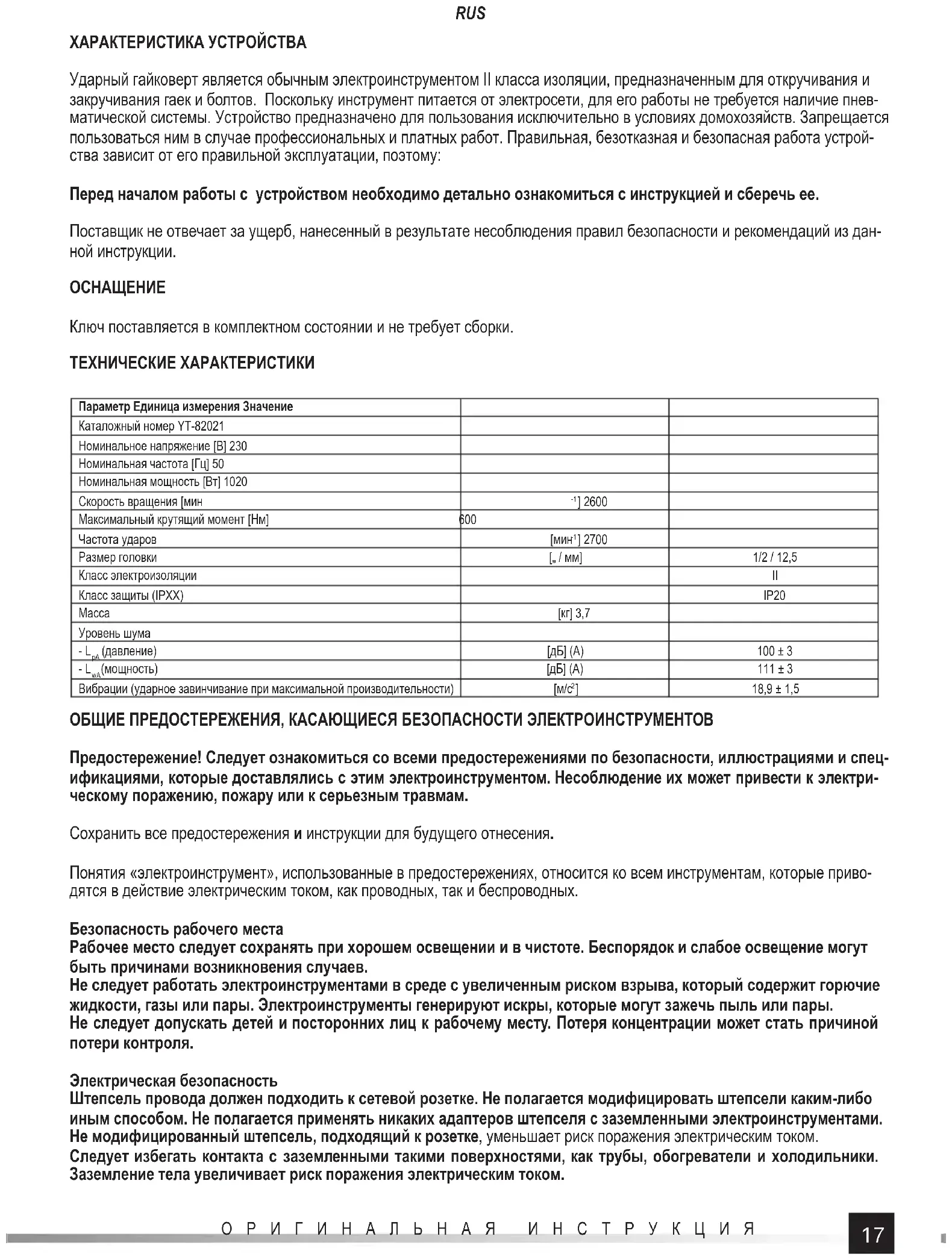 Ключ поставляется в комплектном состоянии и не требует сборки. ТЕХНИЧЕСКИЕ ХАРАКТЕРИСТИКИ Параметр Единица измерения Значение Каталожный номер YT-82021 Номинальное напряжение [В] 230 Номинальная частота [Гц] 50 Номинальная мощность [Вт] 1020 Скорость вращения [мин