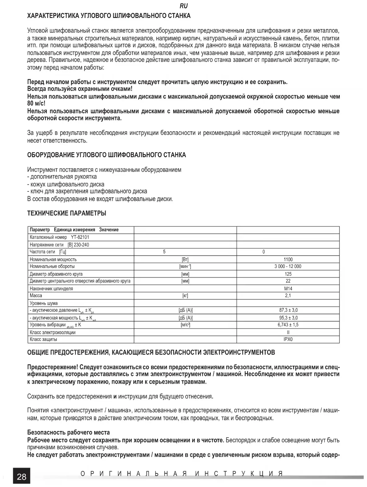 80 м/с! Нельзя пользоваться шлифовальными дисками с максимальной допускаемой оборотной скоростью меньше оборотной скорости инструмента. За ущерб в результате несоблюдения инструкции безопасности и рекомендаций настоящей инструкции поставщик не несет ответственность. ОБОРУДОВАНИЕ УГЛОВОГО ШЛИФОВАЛЬНОГО СТАНКА Инструмент поставляется с нижеуказанным оборудованием - дополнительная рукоятка - кожух шлифовального диска - ключ для закрепления шлифовального диска В состав оборудования не входят шлифовальные диски. ТЕХНИЧЕСКИЕ ПАРАМЕТРЫ Параметр Единица измерения Значение Каталожный номер YT-82101 Напряжение сети [В] 230-240 Частота сети [Гц]50 Номинальная мощность [Вт] 1100 Номинальные обороты [мин