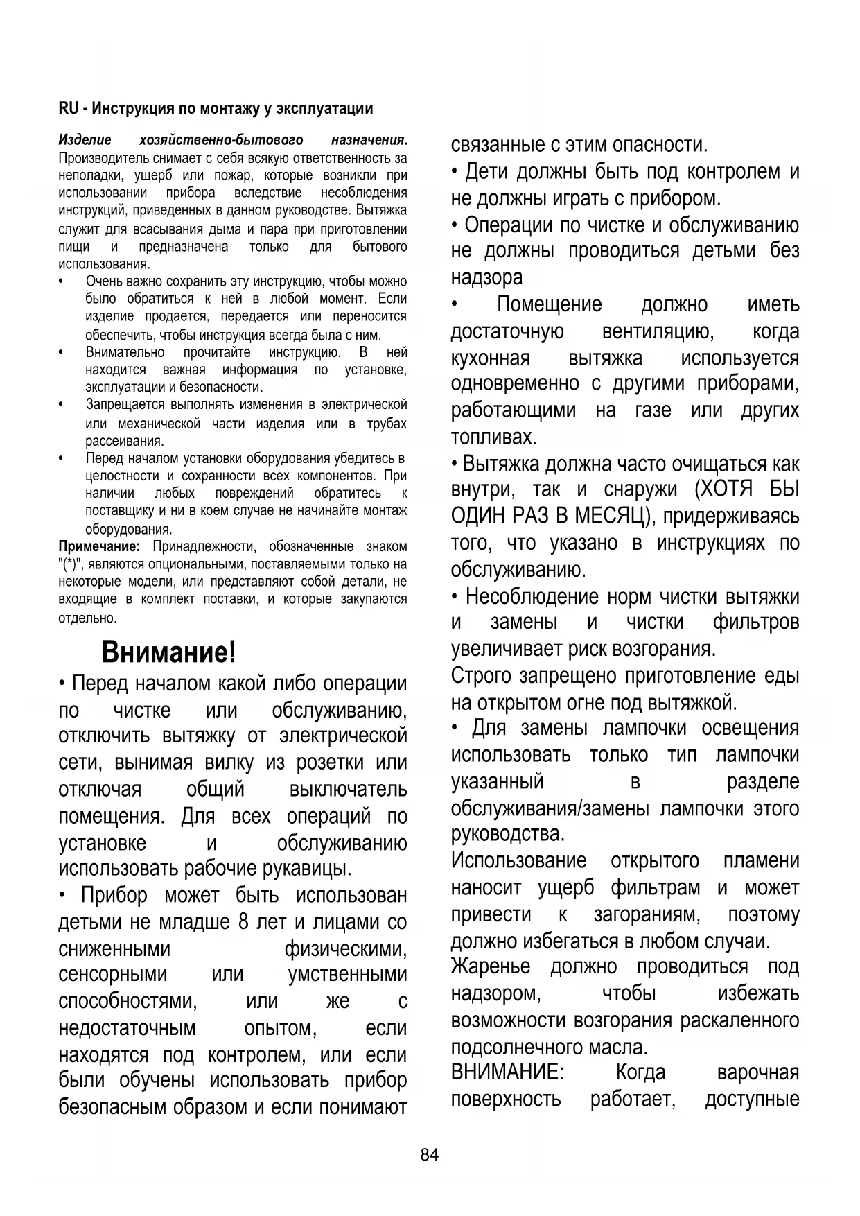 - Вытяжка НИКОГДА не должна использоваться, как опорная поверхность, если только не указано иначе.