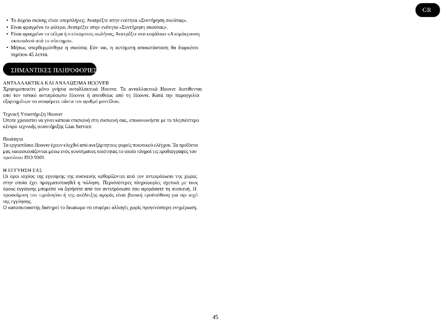 Τα εργοστάσια Hoover έχουν ελεχθεί από ανεξάρτητους φορείς ποιοτικού ελέγχου. Τα προϊόντα μας κατασκευάζονται μέσω ενός συστήματος ποιότητας το οποίο πληροί τις προδιαγραφές του προτύπου ISO 9001. Η ΕΓΓΥΗΣΗ ΣΑΣ Οι όροι ισχύος της εγγύησης της συσκευής καθορίζονται από τον αντιπρόσωπο της χώρας στην οποία έχει πραγματοποιηθεί η πώληση. Περισσότερες πληροφορίες σχετικά με τους όρους εγγύησης μπορείτε να ζητήσετε από τον αντιπρόσωπο που αγοράσατε τη συσκευή. Η προσκόμιση του τιμολογίου ή της απόδειξης αγοράς είναι βασική προϋπόθεση για την ισχύ της εγγύησης. Ο κατασκευαστής διατηρεί το δικαίωμα να επιφέρει αλλαγές χωρίς προγενέστερη ενημέρωση. GR46 ИНСТРУКЦИИ ПО БЕЗОПАСНОМУ ИСПОЛЬЗОВАНИЮ Данный прибор предназначен только для домашнего использования в соответствии с описанием, приведенным в настоящем Руководстве пользователя. Использование этого устройства в условиях, отличных от домашних, или с функциями, отличными от обычных функций домашнего хозяйства, такое как коммерческое использование исключено.Ненадлежащее использование устройства приводит к снижению срока его службы и прекращает действие гарантии производителя.Производитель не несет ответственности за повреждение устройства,убыток или потери, вызванные использованием Прежде чем приступить к эксплуатации данного бытового электроприбора, убедитесь в том, что вы понимаете настоящее руководство. Не оставляйте прибор включенным в розетку. После использования или перед очисткой или обслуживанием всегда вынимайте вилку из розетки. Данный прибор не предназначен для использования лицами (включая детей до 8 лет) с пониженными физическими, психическими или умственными способностями или при отсутствии у них опыта или знаний, если они не находятся под контролем или не проинструктированы об использовании прибора лицом, отвечающим за их безопасность. Дети должны находиться под присмотром для недопущения игры с прибором. Все упаковочные материалы должны храниться в недоступном для детей месте (риск удушения). Если провод питания поврежден, немедленно отключите прибор. Во избежание угрозы безопасности замену провода питания должен проводить только мастер авторизованной сервисной службы HOOVER. Не приближайте вращающиеся щетки к рукам, ногам, болтающейся одежде и волосам. Используйте только те насадки, расходные материалы или запасные части, которые рекомендует или поставляет HOOVER. Статическое электричество: В процессе чистки ковров некоторых видов может образовываться статическое электричество. Разряд статического электричества не представляет опасности для здоровья. Не используйте прибор для сбора острых предметов, спичек, горячего пепла, окурков или аналогичных предметов. Не используйте прибор для сбора острых предметов, спичек, горячего пепла, окурков или аналогичных предметов. Не распыляйте или не собирайте горючие жидкости, чистящие средства, аэрозоли или прочие пары. Не перевозите пылесос через провод питания и не тяните за провод, вынимая вилку из розетки. В случае неисправности не следует продолжать пользоваться