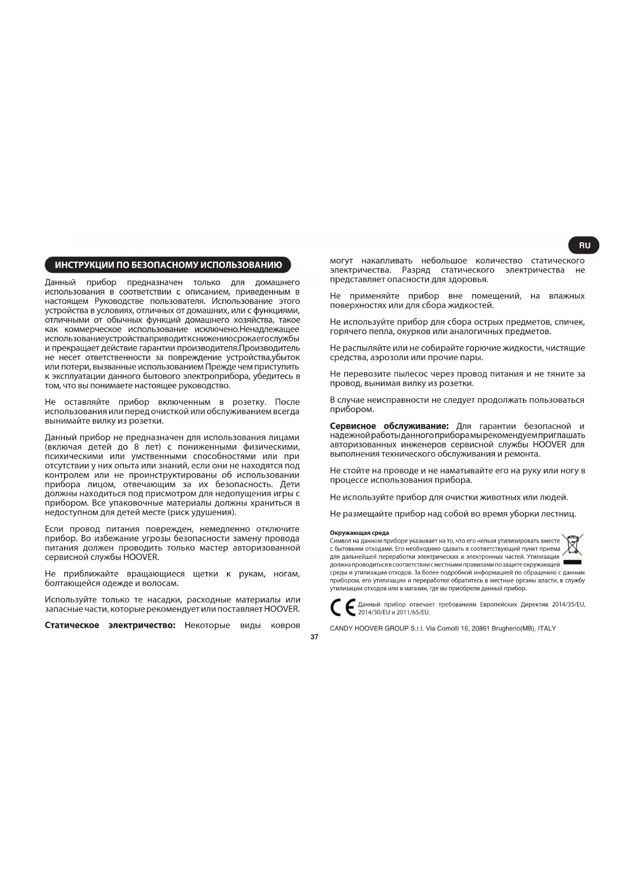 Ο κατασκευαστής διατηρεί το δικαίωμα να επιφέρει αλλαγές χωρίς προγενέστερη ενημέρωση.37 ИНСТРУКЦИИ ПО БЕЗОПАСНОМУ ИСПОЛЬЗОВАНИЮ Данный прибор предназначен только для домашнего использования в соответствии с описанием, приведенным в настоящем Руководстве пользователя. Использование этого устройства в условиях, отличных от домашних, или с функциями, отличными от обычных функций домашнего хозяйства, такое как коммерческое использование исключено.Ненадлежащее использование устройства приводит к снижению срока его службы и прекращает действие гарантии производителя.Производитель не несет ответственности за повреждение устройства,убыток или потери, вызванные использованием Прежде чем приступить к эксплуатации данного бытового электроприбора, убедитесь в том, что вы понимаете настоящее руководство. Не оставляйте прибор включенным в розетку. После использования или перед очисткой или обслуживанием всегда вынимайте вилку из розетки. Данный прибор не предназначен для использования лицами (включая детей до 8 лет) с пониженными физическими, психическими или умственными способностями или при отсутствии у них опыта или знаний, если они не находятся под контролем или не проинструктированы об использовании прибора лицом, отвечающим за их безопасность. Дети должны находиться под присмотром для недопущения игры с прибором. Все упаковочные материалы должны храниться в недоступном для детей месте (риск удушения). Если провод питания поврежден, немедленно отключите прибор. Во избежание угрозы безопасности замену провода питания должен проводить только мастер авторизованной сервисной службы HOOVER. Не приближайте вращающиеся щетки к рукам, ногам, болтающейся одежде и волосам. Используйте только те насадки, расходные материалы или запасные части, которые рекомендует или поставляет HOOVER. Статическое электричество: Некоторые виды ковров могут накапливать небольшое количество статического электричества. Разряд статического электричества не представляет опасности для здоровья. Не применяйте прибор вне помещений, на влажных поверхностях или для сбора жидкостей. Не используйте прибор для сбора острых предметов, спичек, горячего пепла, окурков или аналогичных предметов. Не распыляйте или не собирайте горючие жидкости, чистящие средства, аэрозоли или прочие пары. Не перевозите пылесос через провод питания и не тяните за провод, вынимая вилку из розетки. В случае неисправности не следует продолжать пользоваться