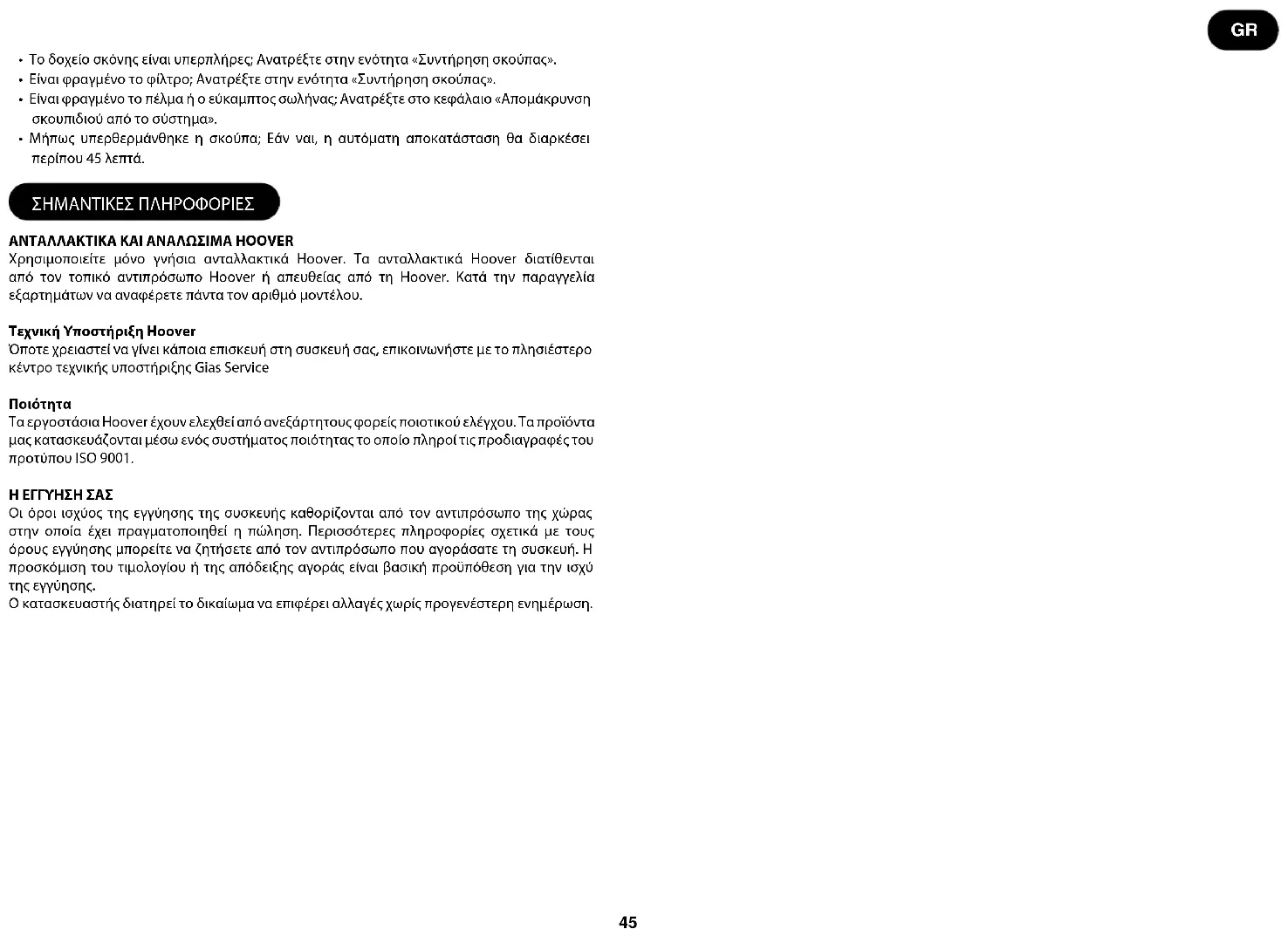 Τα εργοστάσια Hoover έχουν ελεχθεί από ανεξάρτητους φορείς ποιοτικού ελέγχου. Τα προϊόντα μας κατασκευάζονται μέσω ενός συστήματος ποιότητας το οποίο πληροί τις προδιαγραφές του προτύπου ISO 9001. Η ΕΓΓΥΗΣΗ ΣΑΣ Οι όροι ισχύος της εγγύησης της συσκευής καθορίζονται από τον αντιπρόσωπο της χώρας στην οποία έχει πραγματοποιηθεί η πώληση. Περισσότερες πληροφορίες σχετικά με τους όρους εγγύησης μπορείτε να ζητήσετε από τον αντιπρόσωπο που αγοράσατε τη συσκευή. Η προσκόμιση του τιμολογίου ή της απόδειξης αγοράς είναι βασική προϋπόθεση για την ισχύ της εγγύησης. Ο κατασκευαστής διατηρεί το δικαίωμα να επιφέρει αλλαγές χωρίς προγενέστερη ενημέρωση. GR46 ИНСТРУКЦИИ ПО БЕЗОПАСНОМУ ИСПОЛЬЗОВАНИЮ Данный прибор предназначен только для домашнего использования в соответствии с описанием, приведенным в настоящем Руководстве пользователя. Использование этого устройства в условиях, отличных от домашних, или с функциями, отличными от обычных функций домашнего хозяйства, такое как коммерческое использование исключено.Ненадлежащее использование устройства приводит к снижению срока его службы и прекращает действие гарантии производителя.Производитель не несет ответственности за повреждение устройства,убыток или потери, вызванные использованием Прежде чем приступить к эксплуатации данного бытового электроприбора, убедитесь в том, что вы понимаете настоящее руководство. Не оставляйте прибор включенным в розетку. После использования или перед очисткой или обслуживанием всегда вынимайте вилку из розетки. Данный прибор не предназначен для использования лицами (включая детей до 8 лет) с пониженными физическими, психическими или умственными способностями или при отсутствии у них опыта или знаний, если они не находятся под контролем или не проинструктированы об использовании прибора лицом, отвечающим за их безопасность. Дети должны находиться под присмотром для недопущения игры с прибором. Все упаковочные материалы должны храниться в недоступном для детей месте (риск удушения). Если провод питания поврежден, немедленно отключите прибор. Во избежание угрозы безопасности замену провода питания должен проводить только мастер авторизованной сервисной службы HOOVER. Не приближайте вращающиеся щетки к рукам, ногам, болтающейся одежде и волосам. Используйте только те насадки, расходные материалы или запасные части, которые рекомендует или поставляет HOOVER. Статическое электричество: В процессе чистки ковров некоторых видов может образовываться статическое электричество. Разряд статического электричества не представляет опасности для здоровья. Не используйте прибор для сбора острых предметов, спичек, горячего пепла, окурков или аналогичных предметов. Не используйте прибор для сбора острых предметов, спичек, горячего пепла, окурков или аналогичных предметов. Не распыляйте или не собирайте горючие жидкости, чистящие средства, аэрозоли или прочие пары. Не перевозите пылесос через провод питания и не тяните за провод, вынимая вилку из розетки. В случае неисправности не следует продолжать пользоваться
