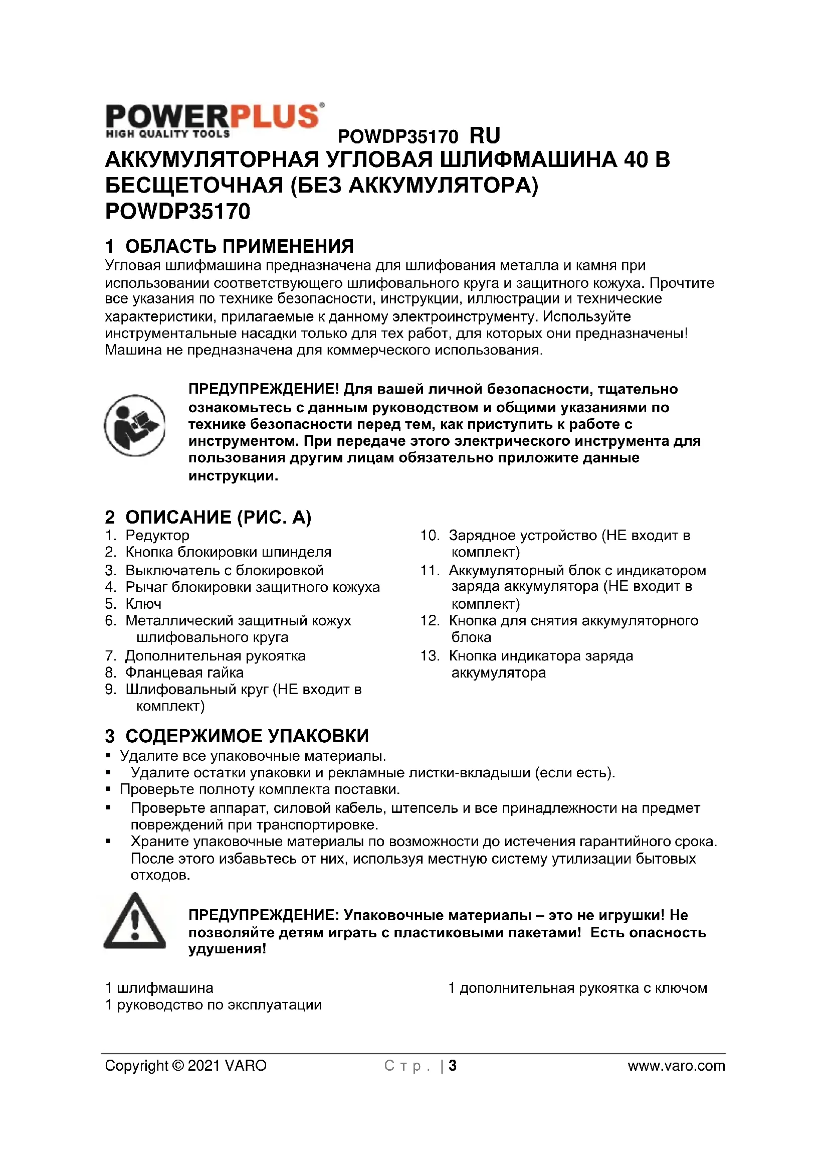 - 17 ДЕКЛАРАЦИЯ О СООТВЕТСТВИИ POWDP35170 RU Copyright © 2021 VARO С т р . | 3 www.varo.com АККУМУЛЯТОРНАЯ УГЛОВАЯ ШЛИФМАШИНА 40 В БЕСЩЕТОЧНАЯ (БЕЗ АККУМУЛЯТОРА) POWDP35170 1 ОБЛАСТЬ ПРИМЕНЕНИЯ Угловая шлифмашина предназначена для шлифования металла и камня при использовании соответствующего шлифовального круга и защитного кожуха. Прочтите все указания по технике безопасности, инструкции, иллюстрации и технические характеристики, прилагаемые к данному электроинструменту. Используйте инструментальные насадки только для тех работ, для которых они предназначены! Машина не предназначена для коммерческого использования. ПРЕДУПРЕЖДЕНИЕ! Для вашей личной безопасности, тщательно ознакомьтесь с данным руководством и общими указаниями по технике безопасности перед тем, как приступить к работе с инструментом. При передаче этого электрического инструмента для пользования другим лицам обязательно приложите данные инструкции. 2 ОПИСАНИЕ (РИС. A) p. 15