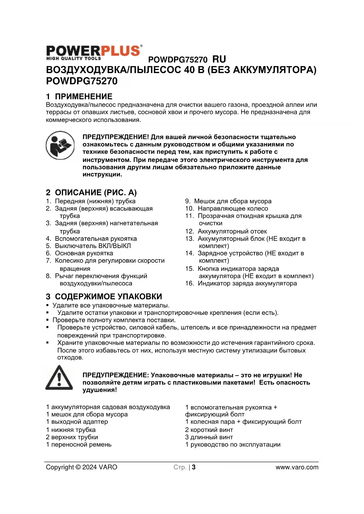 - 16 ДЕКЛАРАЦИЯ О СООТВЕТСТВИИ POWDPG75270 RU Copyright © 2024 VARO Стр. | 3 www.varo.com ВОЗДУХОДУВКА/ПЫЛЕСОС 40 В (БЕЗ АККУМУЛЯТОРА) POWDPG75270 1 ПРИМЕНЕНИЕ Воздуходувка/пылесос предназначена для очистки вашего газона, проездной аллеи или террасы от опавших листьев, сосновой хвои и прочего мусора. Не предназначена для коммерческого использования. ПРЕДУПРЕЖДЕНИЕ! Для вашей личной безопасности тщательно ознакомьтесь с данным руководством и общими указаниями по технике безопасности перед тем, как приступить к работе с инструментом. При передаче этого электрического инструмента для пользования другим лицам обязательно приложите данные инструкции. 2 ОПИСАНИЕ (РИС. А) p. 15