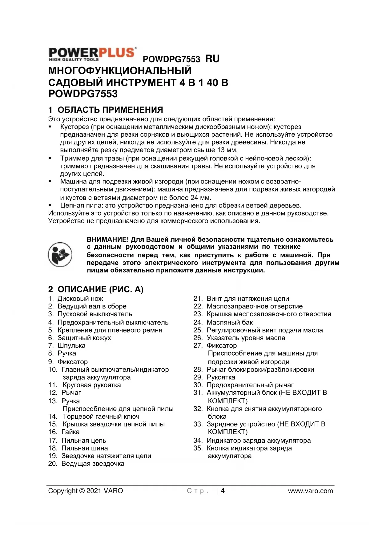 - Для обеспечения оптимальной работы этого инструмента его необходимо заряжать минимум 1 раз в месяц. 16 ОКРУЖАЮЩАЯ СРЕДА Если ваш аппарат требует замены после длительного использования, не выбрасывайте его вместе с домашним мусором, а используйте экологически безопасный способ для его утилизации. С отходами электрических машин нельзя поступать, как с обычными домашними отходами. Позаботьтесь об утилизации там, где для этого естьPOWDPG7553 RU Copyright © 2021 VARO С т р . | 26 www.varo.com соответствующие установки. Проконсультируйтесь у местных органов власти или у продавца о возможности утилизации. 17 ДЕКЛАРАЦИЯ СООТВЕТСТВИЯ VARO N.V. - Vic. Van Rompuy N.V. Joseph Van Instraat 9 - BE2500 Lier - БЕЛЬГИЯ, настоящим заявляет, что Продукт: МНОГОФУНКЦИОНАЛЬНЫЙ САДОВЫЙ ИНСТРУМЕНТ 4 В 1 Марка: POWERplus Модель: POWDPG7553 соответствует обязательным требованиям и иным соответствующим положениям действующих Европейских директив, основанных на Европейских гармонизированных стандартах. Любое несанкционированное изменение устройства аннулирует данное