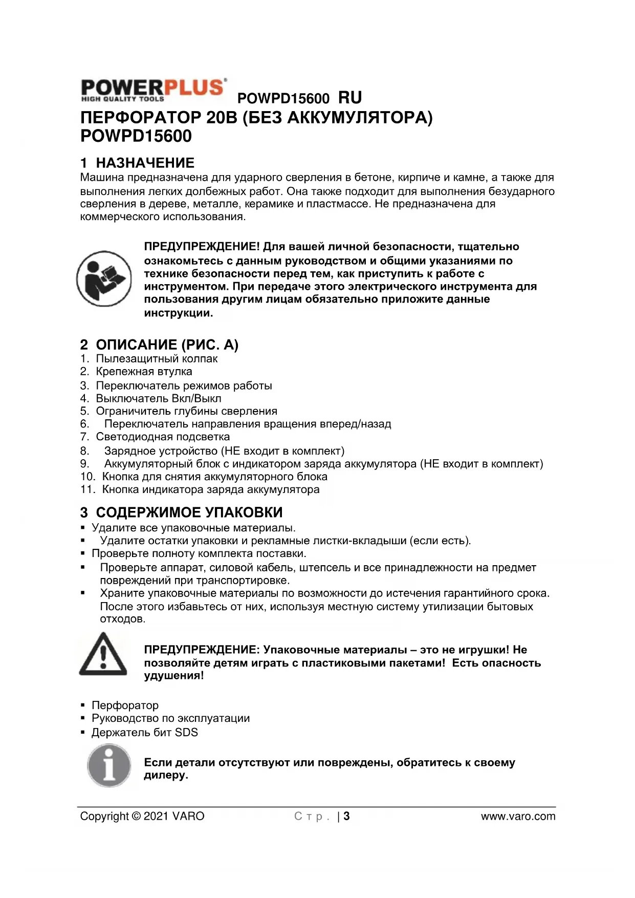 - 15 ДЕКЛАРАЦИЯ О СООТВЕТСТВИИ POWPD15600 RU Copyright © 2021 VARO С т р . | 3 www.varo.com ПЕРФОРАТОР 20В (БЕЗ АККУМУЛЯТОРА) POWPD15600 1 НАЗНАЧЕНИЕ Машина предназначена для ударного сверления в бетоне, кирпиче и камне, а также для выполнения легких долбежных работ. Она также подходит для выполнения безударного сверления в дереве, металле, керамике и пластмассе. Не предназначена для коммерческого использования. ПРЕДУПРЕЖДЕНИЕ! Для вашей личной безопасности, тщательно ознакомьтесь с данным руководством и общими указаниями по технике безопасности перед тем, как приступить к работе с инструментом. При передаче этого электрического инструмента для пользования другим лицам обязательно приложите данные инструкции. 2 ОПИСАНИЕ (РИС. А) p. 14