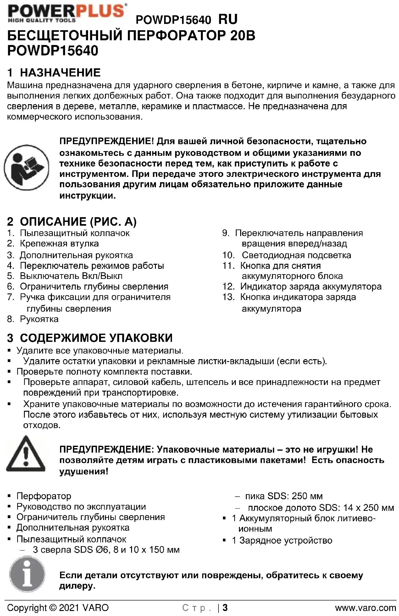 Скачайте инструкцию для вашего дрель в формате PDF бесплатно! Найдите своё руководство POWDP15640 - PowerPlus и возьмите своё электронное устройство обратно в руки. На этой странице опубликованы все документы, необходимые для использования вашего устройства. POWDP15640 бренда PowerPlus.