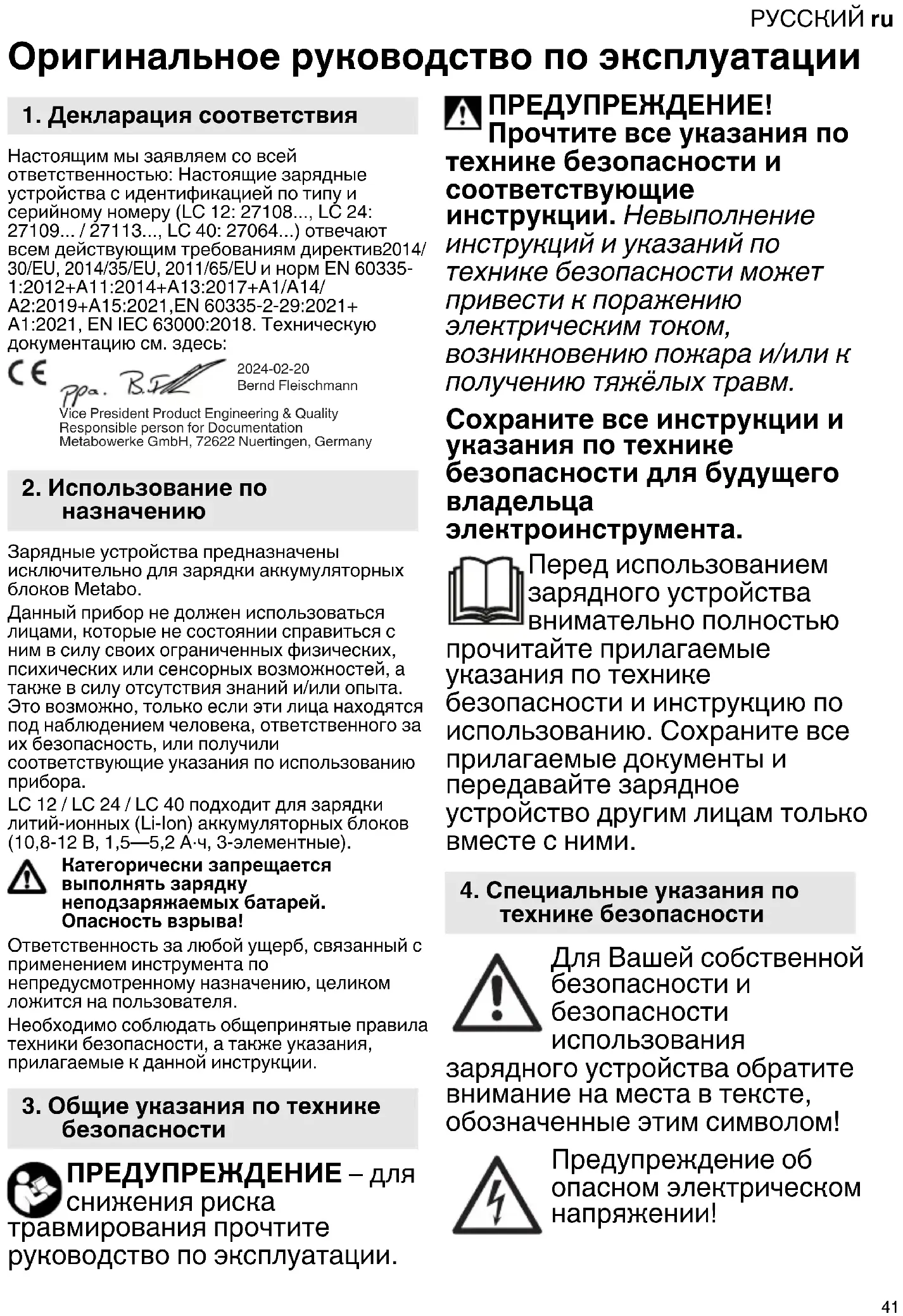 безопасности 2024-02-20 Bernd FleischmannVice President Product Engineering & QualityResponsible person for Documentation Metabowerke GmbH, 72622 Nuertingen, Germany