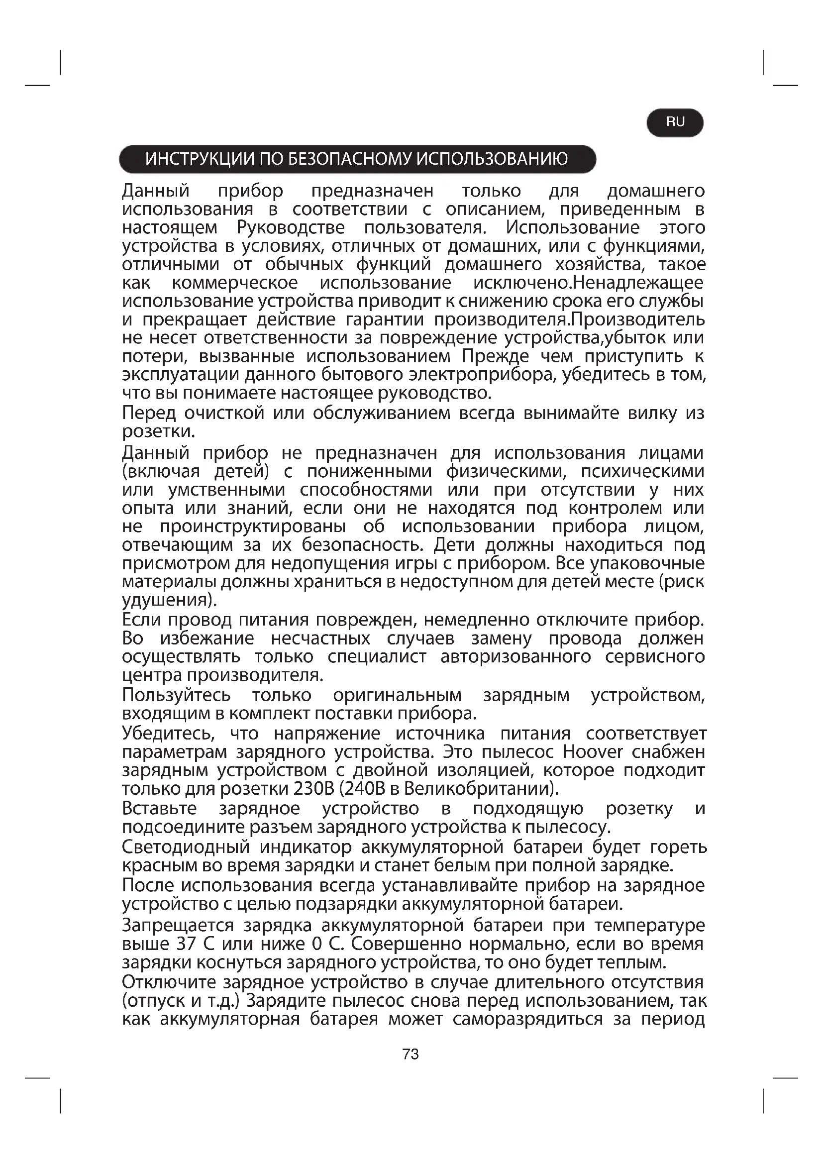 Если провод питания поврежден, немедленно отключите прибор. Во избежание несчастных случаев замену провода должен осуществлять только специалист авторизованного сервисного центра производителя. Пользуйтесь только оригинальным зарядным устройством, входящим в комплект поставки прибора. Убедитесь, что напряжение источника питания соответствует параметрам зарядного устройства. Это пылесос Hoover снабжен зарядным устройством с двойной изоляцией, которое подходит только для розетки 230В (240В в Великобритании). Вставьте зарядное устройство в подходящую розетку и подсоедините разъем зарядного устройства к пылесосу. Светодиодный индикатор аккумуляторной батареи будет гореть красным во время зарядки и станет белым при полной зарядке. После использования всегда устанавливайте прибор на зарядное устройство с целью подзарядки аккумуляторной батареи. Запрещается зарядка аккумуляторной батареи при температуре выше 37 С или ниже 0 С. Совершенно нормально, если во время зарядки коснуться зарядного устройства, то оно будет теплым. Отключите зарядное устройство в случае длительного отсутствия (отпуск и т.д.) Зарядите пылесос снова перед использованием, так как аккумуляторная батарея может саморазрядиться за период RU74