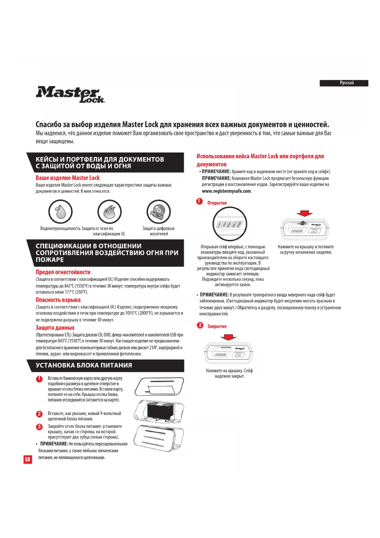 Скачайте инструкцию для вашего Сейф в формате PDF бесплатно! Найдите своё руководство P56069 - Master Lock и возьмите своё электронное устройство обратно в руки. На этой странице опубликованы все документы, необходимые для использования вашего устройства. P56069 бренда Master Lock.