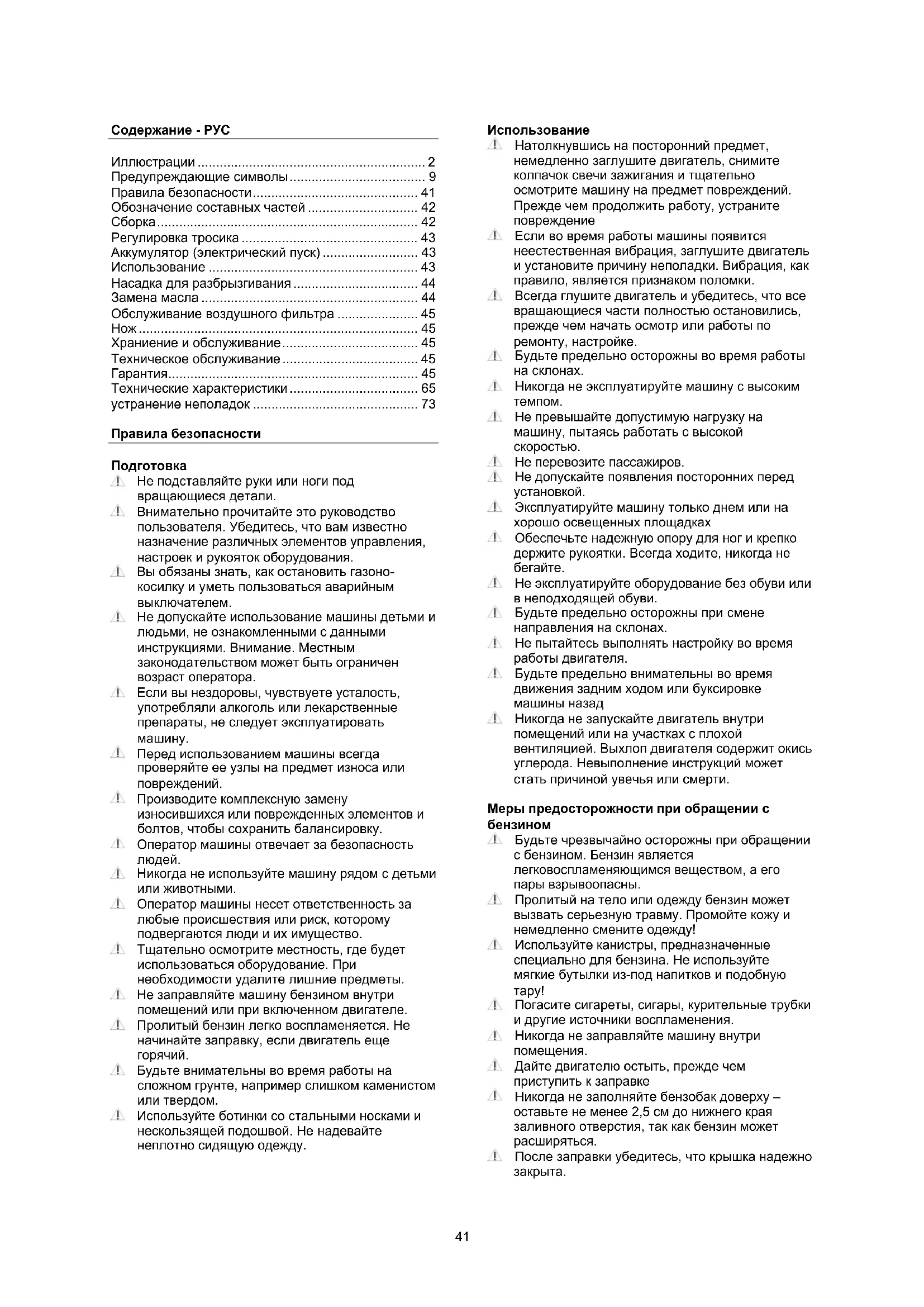 Не эксплуатируйте оборудование без обуви или в неподходящей обуви. Будьте предельно осторожны при смене направления на склонах. Не пытайтесь выполнять настройку во время работы двигателя. Будьте предельно внимательны во время движения задним ходом или буксировке машины назад Никогда не запускайте двигатель внутри помещений или на участках с плохой вентиляцией. Выхлоп двигателя содержит окись углерода. Невыполнение инструкций может стать причиной увечья или смерти. Меры предосторожности при обращении с