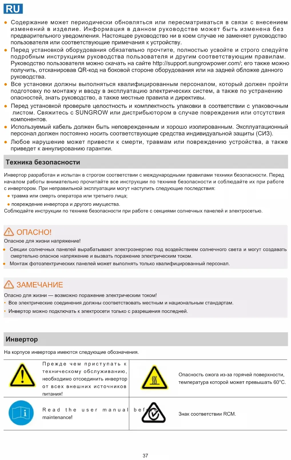 ● Содержание может периодически обновляться или пересматриваться в связи с внесением изменений в изделие. Информация в данном руководстве может быть изменена без предварительного уведомления. Настоящее руководство ни в коем случае не заменяет руководство пользователя или соответствующие примечания к устройству. ● Перед установкой оборудования обязательно прочтите, полностью усвойте и строго следуйте подробным инструкциям руководства пользователя и другим соответствующим правилам. Руководство пользователя можно скачать на сайте http://support.sungrowpower.com/; его также можно получить, отсканировав QR-код на боковой стороне оборудования или на задней обложке данного руководства. ● Все установки должны выполняться квалифицированным персоналом, который должен пройти подготовку по монтажу и вводу в эксплуатацию электрических систем, а также по устранению опасностей, знать руководство, а также местные правила и директивы. ● Перед установкой проверьте целостность и комплектность упаковки в соответствии с упаковочным листом. Свяжитесь с SUNGROW или дистрибьютором в случае повреждения или отсутствия компонентов. ● Используемый кабель должен быть неповрежденным и хорошо изолированным. Эксплуатационный персонал должен постоянно носить соответствующие средства индивидуальной защиты (СИЗ). ● Любое нарушение может привести к смерти, травмам или повреждению устройства, а также приведет к аннулированию гарантии. Техника безопасности Инвертор разработан и испытан в строгом соответствии с международными правилами техники безопасности. Перед началом работы внимательно прочитайте все инструкции по технике безопасности и соблюдайте их при работе с инвертором. При неправильной эксплуатации могут наступить следующие последствия: ● травма или смерть оператора или третьего лица; ● повреждение инвертора и другого имущества. Соблюдайте инструкции по технике безопасности при работе с секциями солнечных панелей и электросетью.