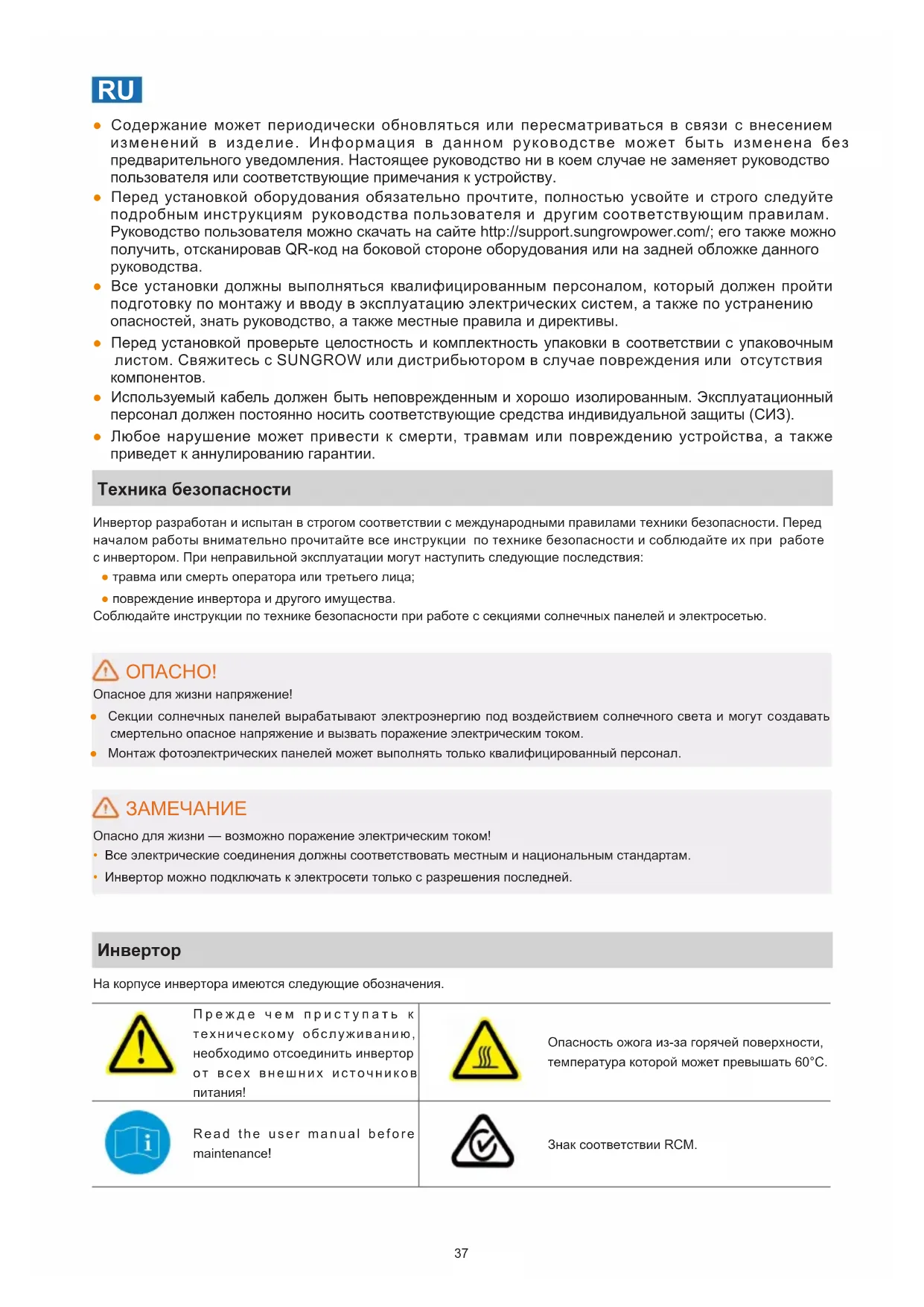 ● Содержание может периодически обновляться или пересматриваться в связи с внесением изменений в изделие. Информация в данном руководстве может быть изменена без предварительного уведомления. Настоящее руководство ни в коем случае не заменяет руководство пользователя или соответствующие примечания к устройству. ● Перед установкой оборудования обязательно прочтите, полностью усвойте и строго следуйте подробным инструкциям руководства пользователя и другим соответствующим правилам. Руководство пользователя можно скачать на сайте http://support.sungrowpower.com/; его также можно получить, отсканировав QR-код на боковой стороне оборудования или на задней обложке данного руководства. ● Все установки должны выполняться квалифицированным персоналом, который должен пройти подготовку по монтажу и вводу в эксплуатацию электрических систем, а также по устранению опасностей, знать руководство, а также местные правила и директивы. ● Перед установкой проверьте целостность и комплектность упаковки в соответствии с упаковочным листом. Свяжитесь с SUNGROW или дистрибьютором в случае повреждения или отсутствия компонентов. ● Используемый кабель должен быть неповрежденным и хорошо изолированным. Эксплуатационный персонал должен постоянно носить соответствующие средства индивидуальной защиты (СИЗ). ● Любое нарушение может привести к смерти, травмам или повреждению устройства, а также приведет к аннулированию гарантии. Техника безопасности Инвертор разработан и испытан в строгом соответствии с международными правилами техники безопасности. Перед началом работы внимательно прочитайте все инструкции по технике безопасности и соблюдайте их при работе с инвертором. При неправильной эксплуатации могут наступить следующие последствия: ● травма или смерть оператора или третьего лица; ● повреждение инвертора и другого имущества. Соблюдайте инструкции по технике безопасности при работе с секциями солнечных панелей и электросетью.