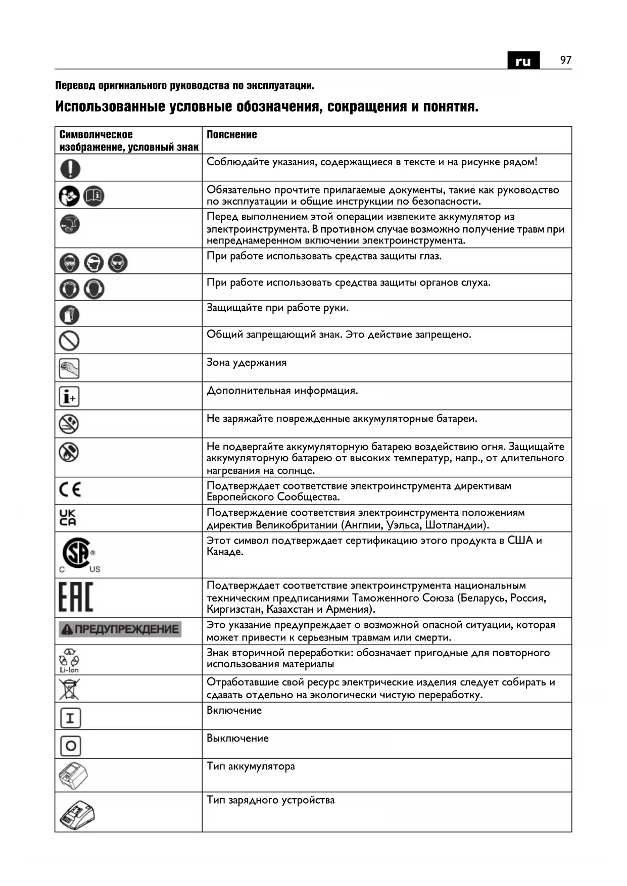 Перевод оригинального руководства по эксплуатации. Использованные условные обозначения, сокращения и понятия. Символическое изображение, условный знак