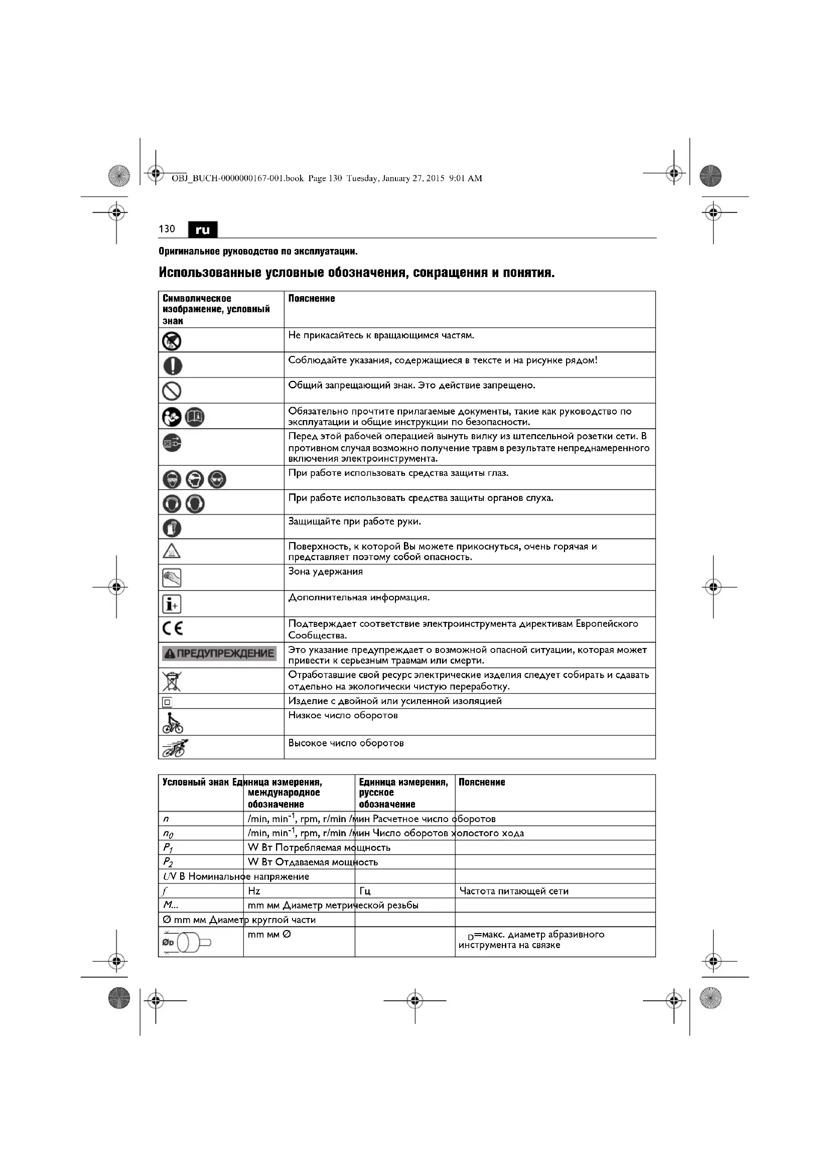 Не прикасайтесь к вращающимся частям. Соблюдайте указания, содержащиеся в тексте и на рисунке рядом! Общий запрещающий знак. Это действие запрещено. Обязательно прочтите прилагаемые документы, такие как руководство по эксплуатации и общие инструкции по безопасности. Перед этой рабочей операцией вынуть вилку из штепсельной розетки сети. В противном случая возможно получение травм в результате непреднамеренного включения электроинструмента. При работе использовать средства защиты глаз. При работе использовать средства защиты органов слуха. Защищайте при работе руки. Поверхность, к которой Вы можете прикоснуться, очень горячая и представляет поэтому собой опасность. Зона удержания Дополнительная информация. Подтверждает соответствие электроинструмента директивам Европейского Сообщества. Это указание предупреждает о возможной опасной ситуации, которая может привести к серьезным травмам или смерти. Отработавшие свой ресурс электрические изделия следует собирать и сдавать отдельно на экологически чистую переработку. Изделие с двойной или усиленной изоляцией Низкое число оборотов Высокое число оборотов Условный знак Eдиница измерения, международное обозначение Eдиница измерения,