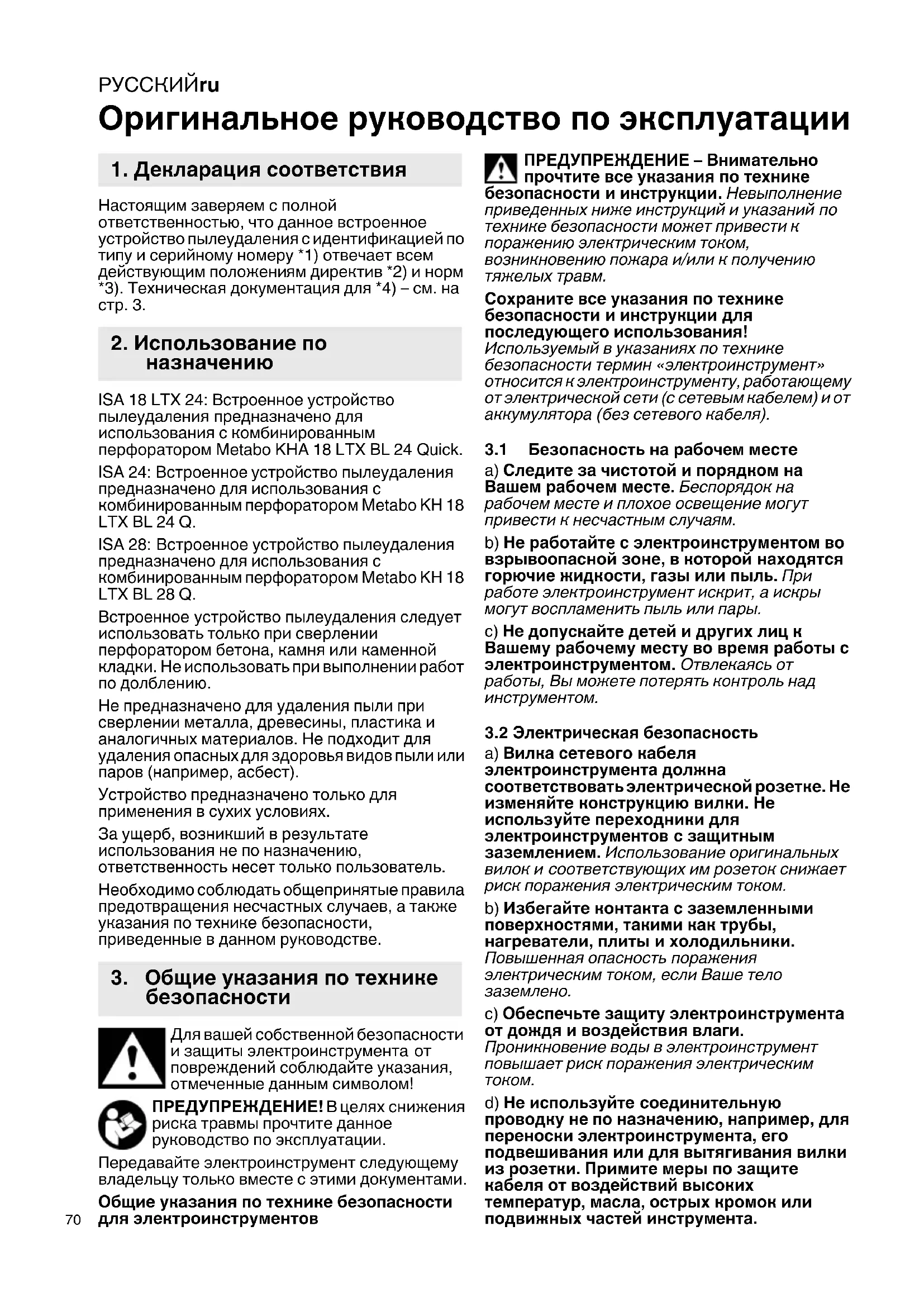 Оригинальное руководство по эксплуатации Настоящим заверяем с полной ответственностью, что данное встроенное устройство пылеудаления с идентификацией по типу и серийному номеру *1) отвечает всем действующим положениям директив *2) и норм *3). Техническая документация для *4) – см. на стр. 3. ISA 18 LTX 24: Встроенное устройство пылеудаления предназначено для использования с комбинированным перфоратором Metabo KHA 18 LTX BL 24 Quick. ISA 24: Встроенное устройство пылеудаления предназначено для использования с комбинированным перфоратором Metabo KH 18 LTX BL 24 Q. ISA 28: Встроенное устройство пылеудаления предназначено для использования с комбинированным перфоратором Metabo KH 18 LTX BL 28 Q. Встроенное устройство пылеудаления следует использовать только при сверлении перфоратором бетона, камня или каменной кладки. Не использовать при выполнении работ по долблению. Не предназначено для удаления пыли при сверлении металла, древесины, пластика и аналогичных материалов. Не подходит для удаления опасных для здоровья видов пыли или паров (например, асбест). Устройство предназначено только для применения в сухих условиях. За ущерб, возникший в результате использования не по назначению, ответственность несет только пользователь. Необходимо соблюдать общепринятые правила предотвращения несчастных случаев, а также указания по технике безопасности, приведенные в данном руководстве. Для вашей собственной безопасности и защиты электроинструмента
