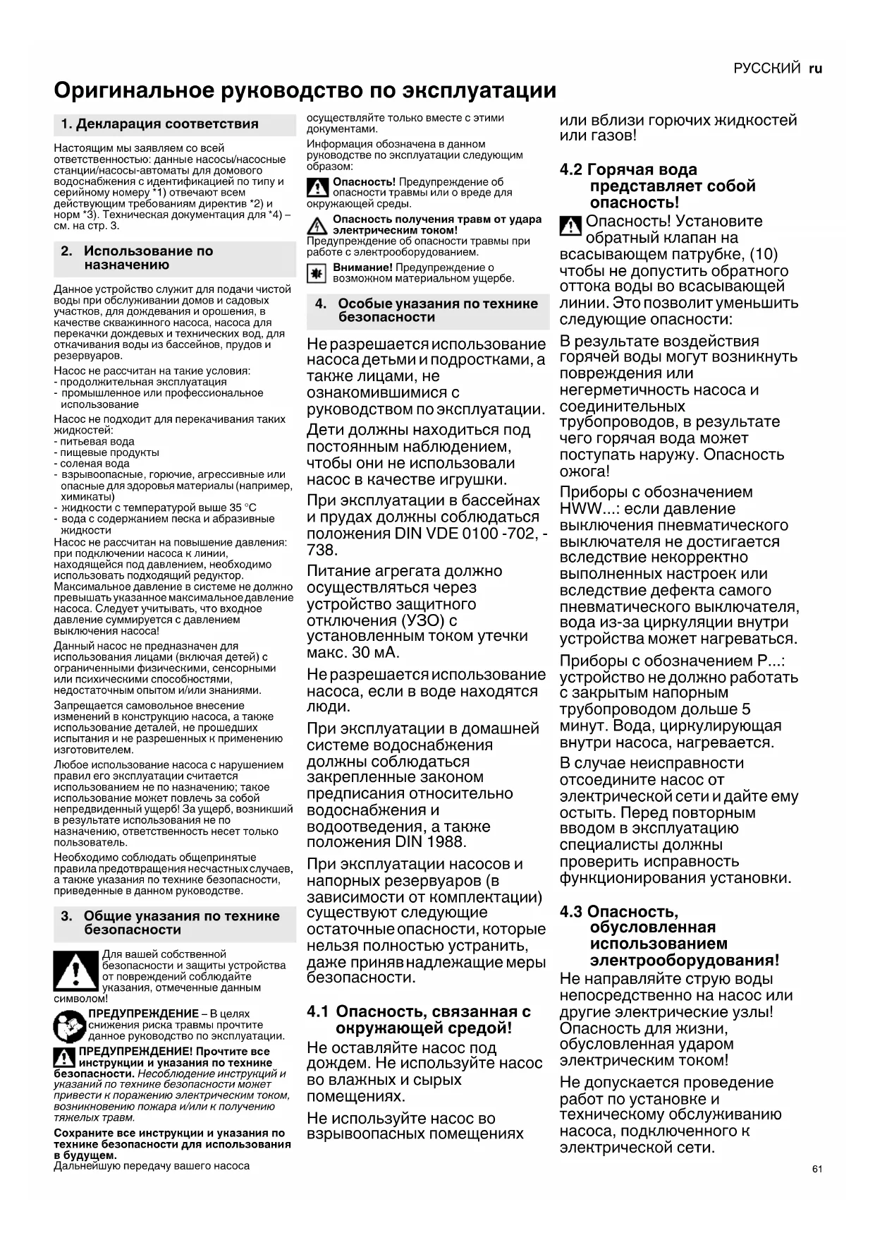 Опасность! Предупреждение об опасности травмы или о вреде для окружающей среды. Опасность получения травм от удара электрическим током! Предупреждение об опасности травмы при работе с электрооборудованием. Внимание! Предупреждение о возможном материальном ущербе. Не разрешается использование насоса детьми и подростками, а также лицами, не ознакомившимися с руководством по эксплуатации. Дети должны находиться под постоянным наблюдением, чтобы они не использовали насос в качестве игрушки. При эксплуатации в бассейнах и прудах должны соблюдаться положения DIN VDE 0100 -702, -