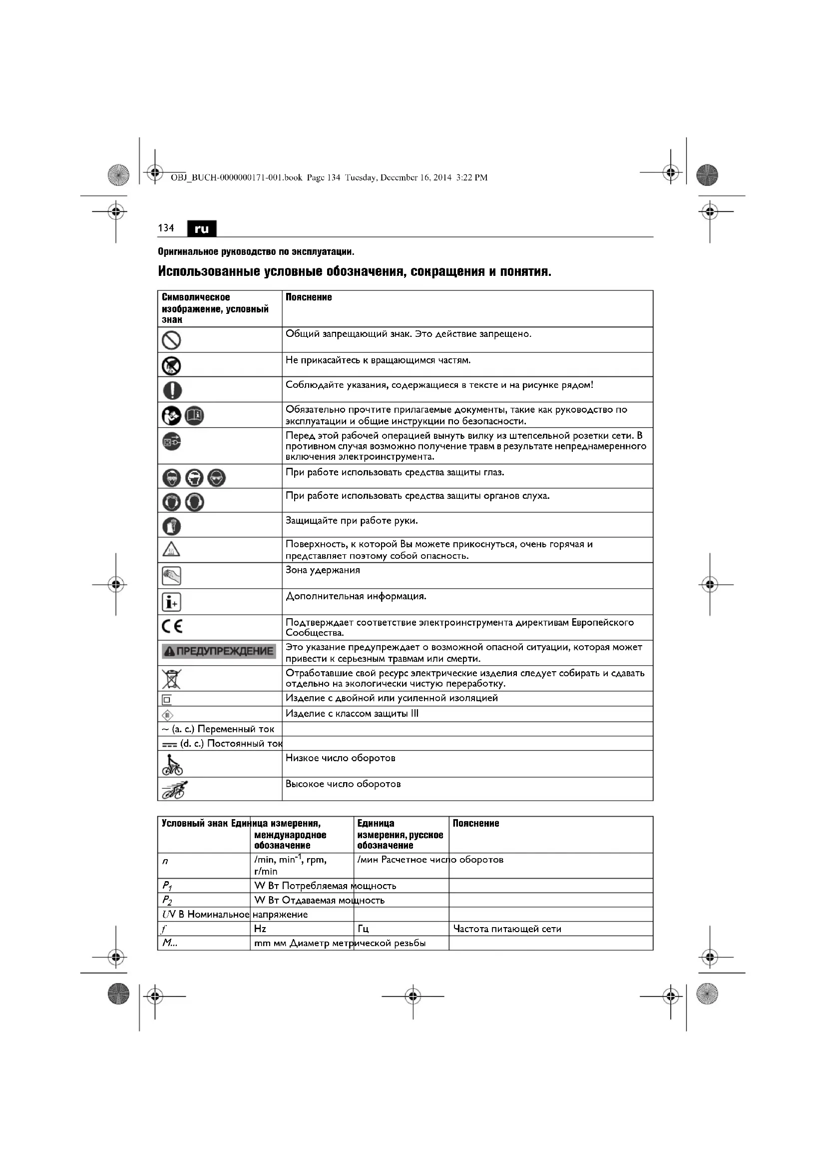 Общий запрещающий знак. Это действие запрещено. Не прикасайтесь к вращающимся частям. Соблюдайте указания, содержащиеся в тексте и на рисунке рядом! Обязательно прочтите прилагаемые документы, такие как руководство по эксплуатации и общие инструкции по безопасности. Перед этой рабочей операцией вынуть вилку из штепсельной розетки сети. В противном случая возможно получение травм в результате непреднамеренного включения электроинструмента. При работе использовать средства защиты глаз. При работе использовать средства защиты органов слуха. Защищайте при работе руки. Поверхность, к которой Вы можете прикоснуться, очень горячая и представляет поэтому собой опасность. Зона удержания Дополнительная информация. Подтверждает соответствие электроинструмента директивам Европейского Сообщества. Это указание предупреждает о возможной опасной ситуации, которая может привести к серьезным травмам или смерти. Отработавшие свой ресурс электрические изделия следует собирать и сдавать отдельно на экологически чистую переработку. Изделие с двойной или усиленной изоляцией Изделие с классом защиты III ~ (a. c.) Переменный ток (d. c.) Постоянный ток Низкое число оборотов Высокое число оборотов Условный знак Eдиница измерения, международное обозначение Eдиница измерения, русское обозначение