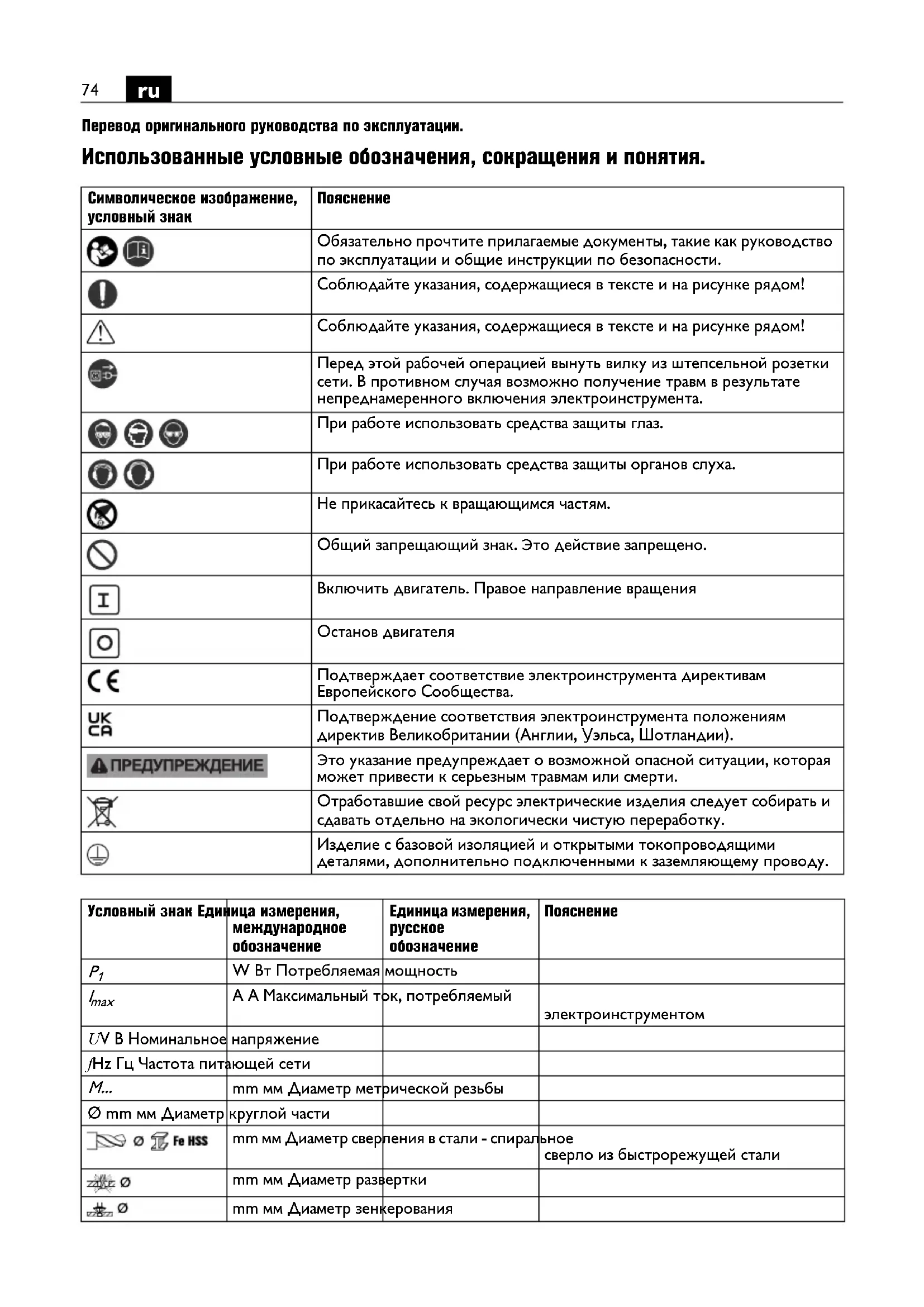 Перевод оригинального руководства по эксплуатации. Использованные условные обозначения, сокращения и понятия. Символическое изображение, условный знак