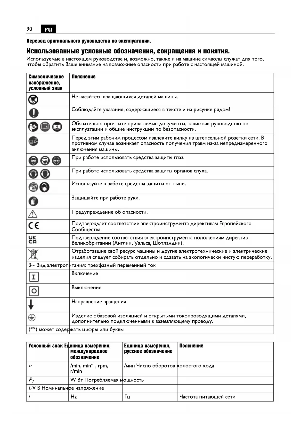 Направление вращения Изделие с базовой изоляцией и открытыми токопроводящими деталями, дополнительно подключенными к заземляющему проводу. (**) может содержать цифры или буквы Условный знак Eдиница измерения, международное обозначение Eдиница измерения, русское обозначение