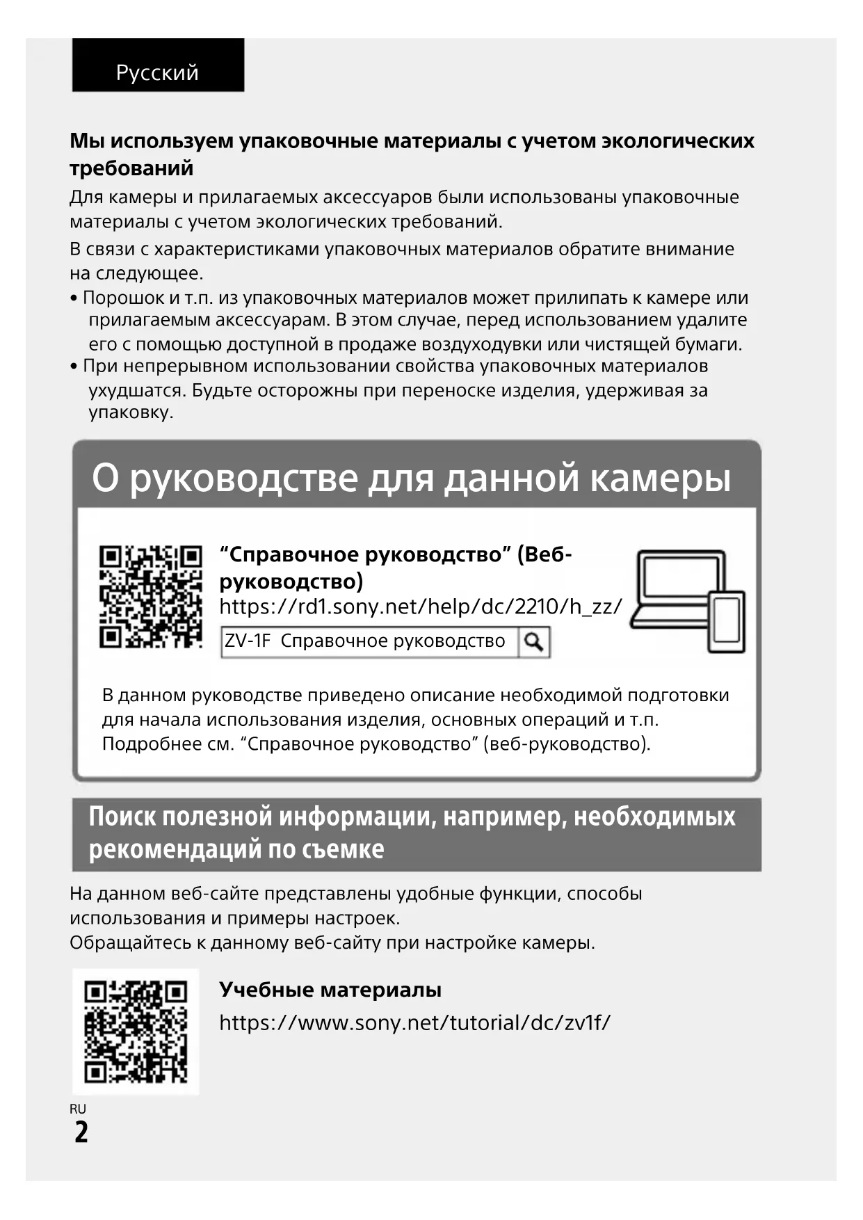 Для камеры и прилагаемых аксессуаров были использованы упаковочные материалы с учетом экологических требований.В связи с характеристиками упаковочных материалов обратите внимание на следующее.• Порошок и т.п. из упаковочных материалов может прилипать к камере или прилагаемым аксессуарам. В этом случае, перед использованием удалите его с помощью доступной в продаже воздуходувки или чистящей бумаги.• При непрерывном использовании свойства упаковочных материалов ухудшатся. Будьте осторожны при переноске изделия, удерживая за упаковку. О руководстве для данной камеры https://rd1.sony.net/help/dc/2210/h_zz/ “Справочное руководство” (Веб- руководство) ZV-1F Справочное руководствоВ данном руководстве приведено описание необходимой подготовки для начала использования изделия, основных операций и т.п. Подробнее см. “Справочное руководство” (веб-руководство). Поиск полезной информации, например, необходимых рекомендаций по съемке На данном веб-сайте представлены удобные функции, способы использования и примеры настроек.Обращайтесь к данному веб-сайту при настройке камеры. https://www.sony.net/tutorial/dc/zv1f/ Учебные материалыZV-1F5-041-855-31(1)