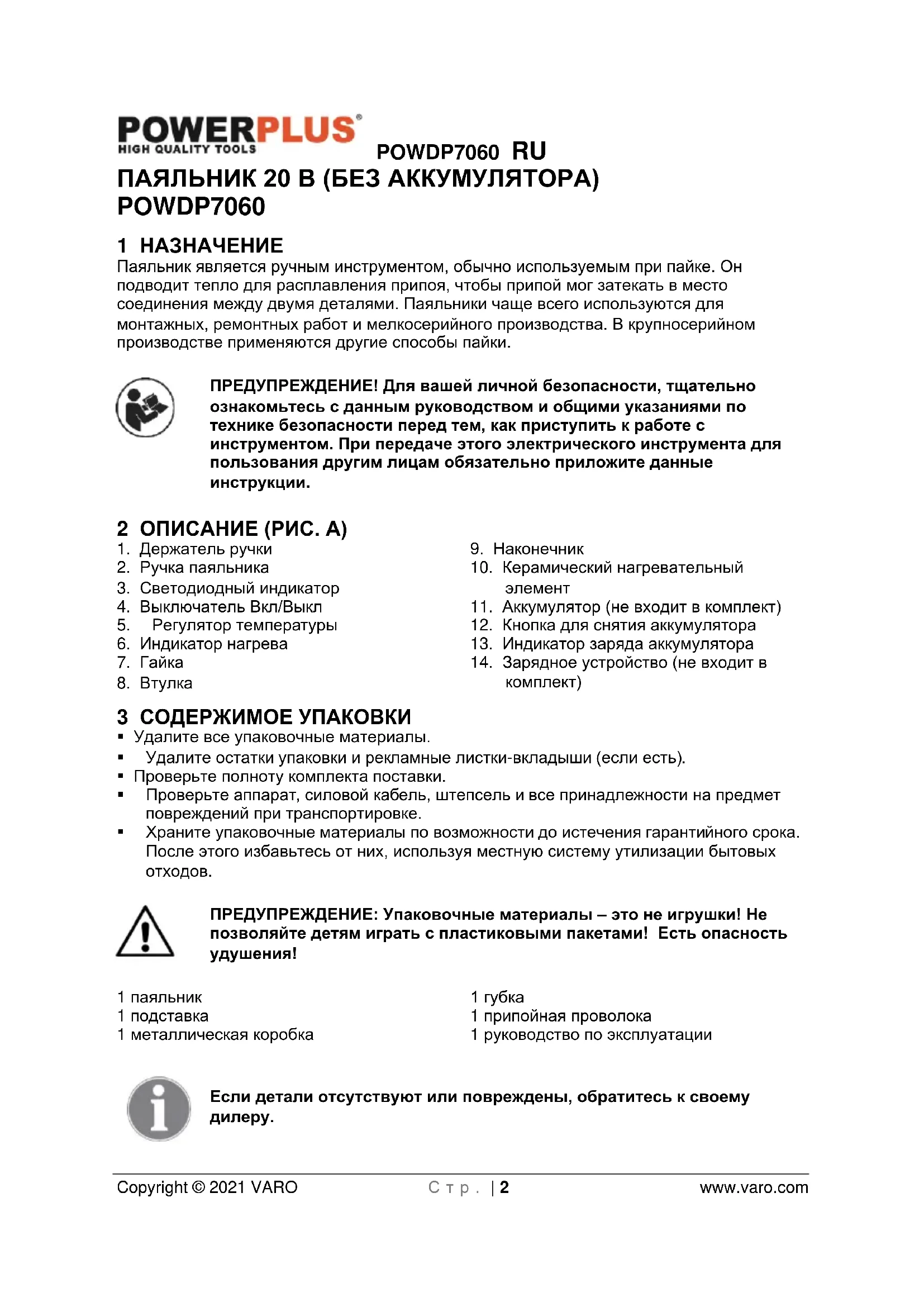 - 12 ОКРУЖАЮЩАЯ СРЕДА POWDP7060 RU Copyright © 2021 VARO С т р . | 2 www.varo.com ПАЯЛЬНИК 20 В (БЕЗ АККУМУЛЯТОРА) POWDP7060 1 НАЗНАЧЕНИЕ Паяльник является ручным инструментом, обычно используемым при пайке. Он подводит тепло для расплавления припоя, чтобы припой мог затекать в место соединения между двумя деталями. Паяльники чаще всего используются для монтажных, ремонтных работ и мелкосерийного производства. В крупносерийном производстве применяются другие способы пайки. ПРЕДУПРЕЖДЕНИЕ! Для вашей личной безопасности, тщательно ознакомьтесь с данным руководством и общими указаниями по технике безопасности перед тем, как приступить к работе с инструментом. При передаче этого электрического инструмента для пользования другим лицам обязательно приложите данные инструкции. 2 ОПИСАНИЕ (РИС. А) p. 10