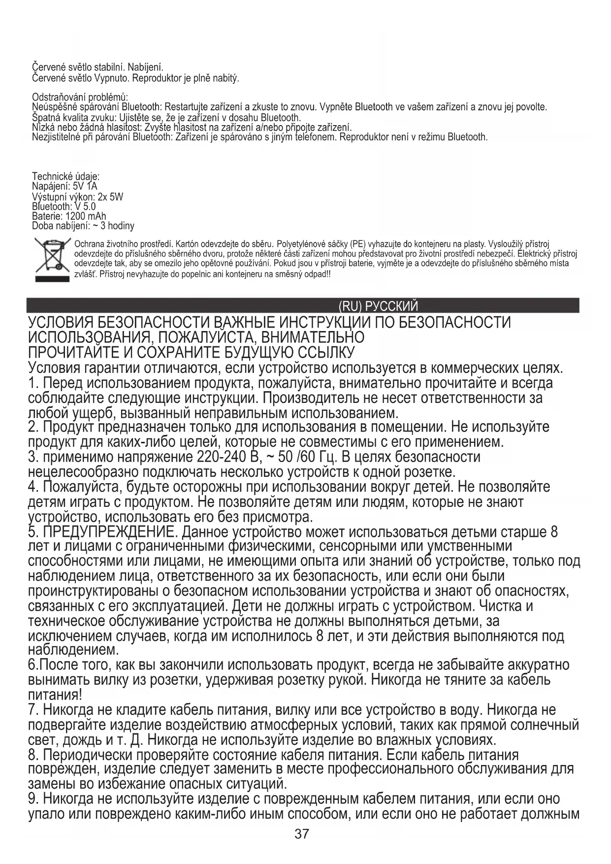Состояние светового индикатора: Мигающий синий свет. Выполняется сопряжение Bluetooth / Низкий заряд батареи. Синий свет стабилен. Устройство подключено к устройству Bluetooth/флэш-накопителю/SD-карте. Выходная мощность: 2x 5 Вт Bluetooth: версия 5.0 Невозможно обнаружить при сопряжении Bluetooth: устройство сопряжено с другим телефоном. Динамик не находится в режиме Bluetooth. Низкий уровень громкости или его отсутствие: увеличьте громкость на устройстве и/или подключите устройство. Время зарядки: ~ 3 часа Аккумулятор: 1200 мАч