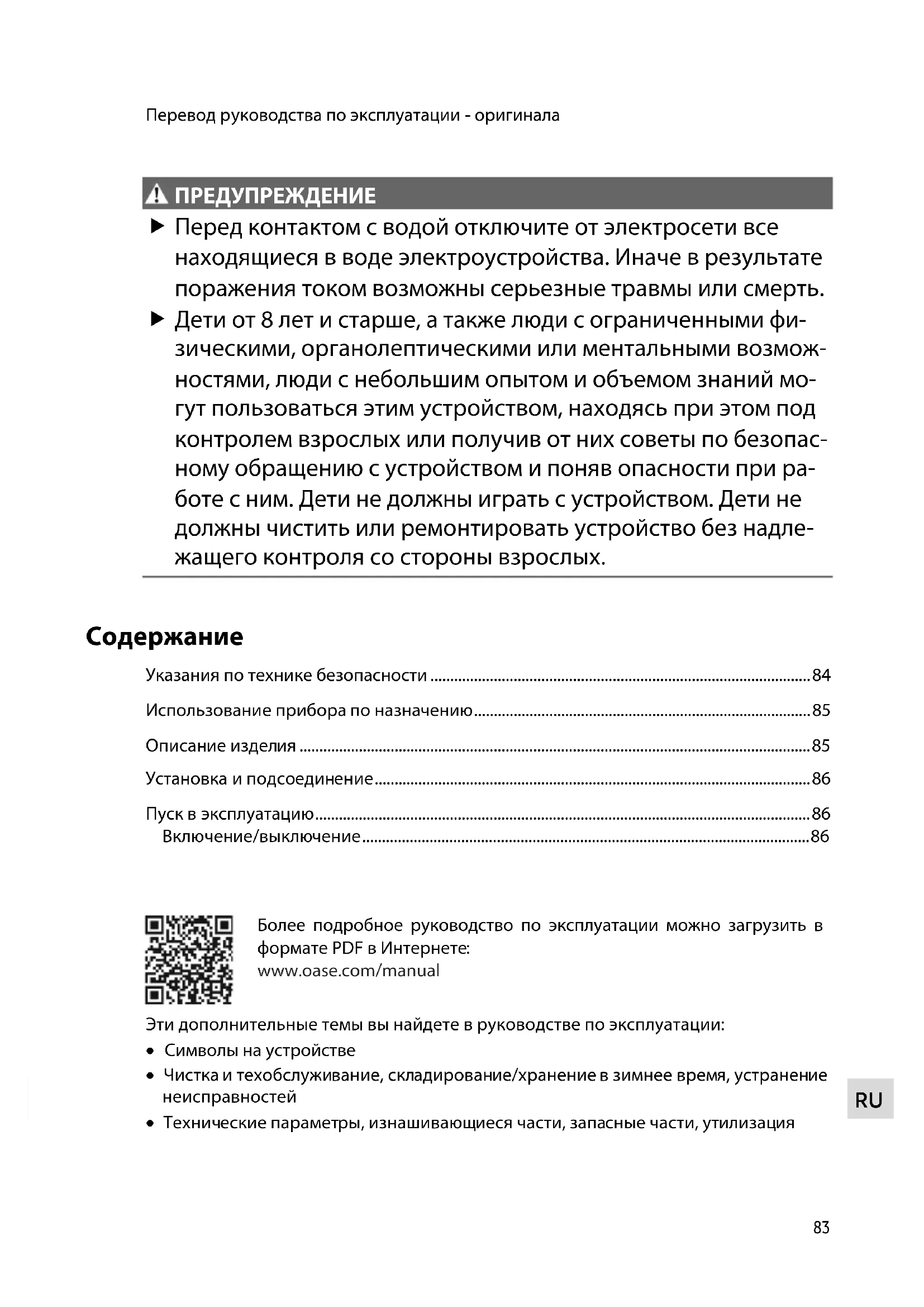 Перевод руководства по эксплуатации - оригинала RU ПРЕДУП РЕЖД ЕНИ Е ПРЕДУПРЕЖДЕНИЕ Перед контактом с водой отключите от электросети все находящиеся в воде электроустройства. Иначе в результате поражения током возможны серьезные травмы или смерть. Дети от 8 лет и старше, а также люди с ограниченными фи- зическими, органолептическими или ментальными возмож- ностями, люди с небольшим опытом и объемом знаний мо- гут пользоваться этим устройством, находясь при этом под контролем взрослых или получив от них советы по безопас- ному обращению с устройством и поняв опасности при ра- боте с ним. Дети не должны играть с устройством. Дети не должны чистить или ремонтировать устройство без надле- жащего контроля со стороны взрослых.