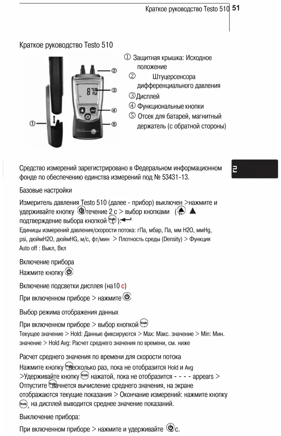 Краткое руководство Testo 510 j Çаùитíаÿ крûøка: Èсõодíое полоæеíие k Øтуцер сеíсора диôôереíциалüíоãо давлеíиÿ l Äисплеé m Ôуíкциоíалüíûе кíопки n Îтсек длÿ áатареé, ìаãíитíûé дерæателü (с оáратíоé стороíû) Средство изìереíиé зареãистрироваíо в Ôедералüíоì иíôорìациоííоì ôоíде по оáеспечеíию едиíства изìереíиé под № 53431-13. Áазовûе íастроéки Èзìерителü давлеíиÿ Testo 510 (далее - приáор) вûключеí >íаæìите и удерæиваéте кíопку в течеíие 2 c > вûáор кíопкаìи ( ), подтверæдеíие вûáора кíопкоé ( ): Åдиíицû изìереíиé давлеíиÿ/скорости потока: ãПа, ìáар, Па, ìì H2O, ììHg, psi, дюéìH2O, дюéìHG, ì/с, ôт/ìиí > Плотíостü средû (Density) > Ôуíкциÿ Auto off : Âûкл, Âкл Âключеíие приáора Íаæìите кíопку . Âключеíие подсветки дисплеÿ (íа10 с) При включеííоì приáоре > íаæìите Âûáор реæиìа отоáраæеíиÿ даííûõ При включеííоì приáоре > вûáор кíопкоé : Текуùее зíачеíие > Hold: Äаííûе ôиксируютсÿ > Max: Ìакс. зíачеíие > Min: Ìиí. зíачеíие > Hold Avg: Pасчет средíеãо зíачеíиÿ по вреìеíи, сì. íиæе Pасчет средíеãо зíачеíиÿ по вреìеíи длÿ скорости потока Íаæìите кíопку íесколüко раз, пока íе отоáразитсÿ Hold и Avg >Óдерæиваéте кíопку íаæатоé, пока íе отоáразитсÿ - - - - appears > Îтпустите íачíетсÿ вûчислеíие средíеãо зíачеíиÿ, íа экраíе отоáраæаютсÿ текуùие показаíиÿ > Îкоíчаíие изìереíиé: íаæìите кíопку