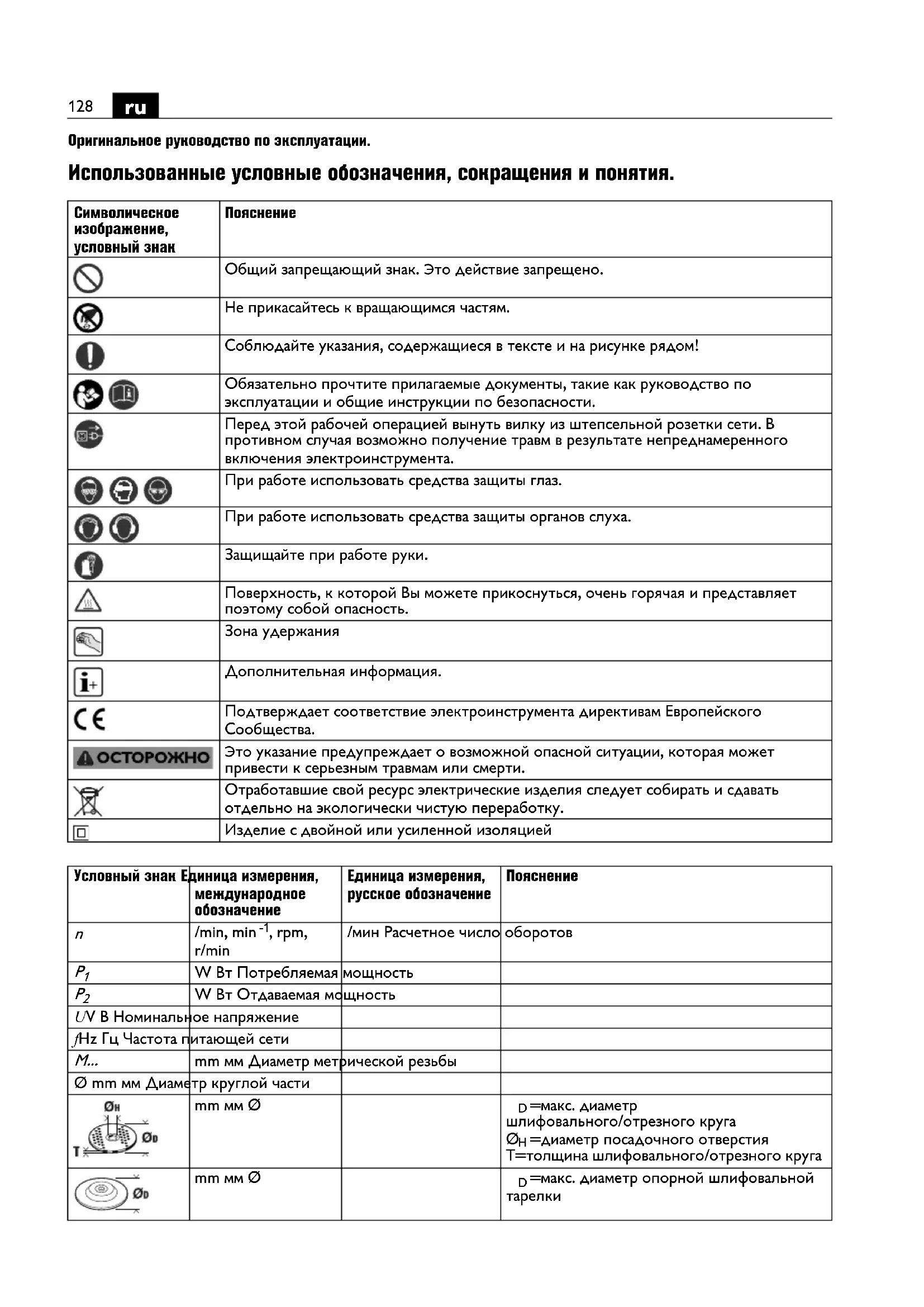 Общий запрещающий знак. Это действие запрещено. Не прикасайтесь к вращающимся частям. Соблюдайте указания, содержащиеся в тексте и на рисунке рядом! Обязательно прочтите прилагаемые документы, такие как руководство по эксплуатации и общие инструкции по безопасности. Перед этой рабочей операцией вынуть вилку из штепсельной розетки сети. В противном случая возможно получение травм в результате непреднамеренного включения электроинструмента. При работе использовать средства защиты глаз. При работе использовать средства защиты органов слуха. Защищайте при работе руки. Поверхность, к которой Вы можете прикоснуться, очень горячая и представляет поэтому собой опасность. Зона удержания Дополнительная информация. Подтверждает соответствие электроинструмента директивам Европейского Сообщества. Это указание предупреждает о возможной опасной ситуации, которая может привести к серьезным травмам или смерти. Отработавшие свой ресурс электрические изделия следует собирать и сдавать отдельно на экологически чистую переработку. Изделие с двойной или усиленной изоляцией Условный знак Eдиница измерения, международное обозначение Eдиница измерения, русское обозначение