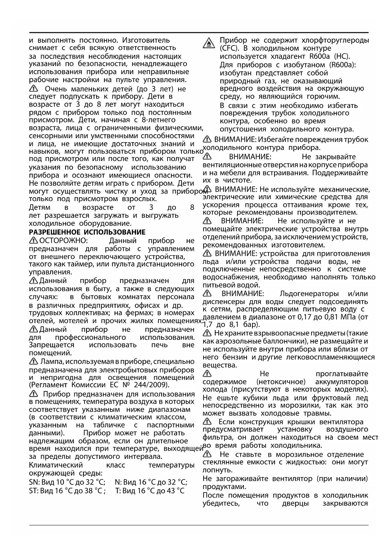 Лампа,используемаявприборе,специально предназначена для электробытовых приборов и непригодна для освещения помещений (Регламент Комиссии ЕС № 244/2009). Прибор предназначен для использования в помещениях, температура воздуха в которых соответствует указанным ниже диапазонам (в соответствии с климатическим классом, указанным на табличке с паспортными данными). Прибор может не работать надлежащим образом, если он длительное время находился при температуре, выходящей за пределы допустимого интервала. Климатический класс температуры окружающей среды: SN: Вид 10 °C до 32 °C; N: Вид 16 °C до 32 °C; ST: Вид 16 °C до 38 °C ; T: Вид 16 °C до 43 °C Прибор не содержит хлорфторуглероды (CFC). В холодильном контуре используется хладагент R600a (HC). Для приборов с изобутаном (R600a): изобутан представляет собой природный газ, не оказывающий вредного воздействия на окружающую среду, но являющийся горючим. В связи с этим необходимо избегать повреждения трубок холодильного контура, особенно во время опустошения холодильного контура. ВНИМАНИЕ: Избегайте повреждения трубок холодильного контура прибора. ВНИМАНИЕ: Не закрывайте вентиляционныеотверстиянакорпусеприбора и на мебели для встраивания. Поддерживайте их в чистоте. ВНИМАНИЕ: Не используйте механические, электрические или химические средства для ускорения процесса оттаивания кроме тех, которые рекомендованы производителем. ВНИМАНИЕ: Не используйте и не помещайте электрические устройства внутрь отделений прибора, за исключением устройств, рекомендованных изготовителем. ВНИМАНИЕ: устройства для приготовления льда и/или устройства подачи воды, не подключенные непосредственно к системе водоснабжения, необходимо наполнять только питьевой водой. ВНИМАНИЕ: Льдогенераторы и/или диспенсеры для воды следует подсоединять к сетям, распределяющим питьевую воду с давлением в диапазоне от 0,17 до 0,81 МПа (от 1,7 до 8,1 бар). Не храните взрывоопасныепредметы(такие как аэрозольные баллончики), не размещайте и не используйте внутри прибора или вблизи от него бензин и другие легковоспламеняющиеся
