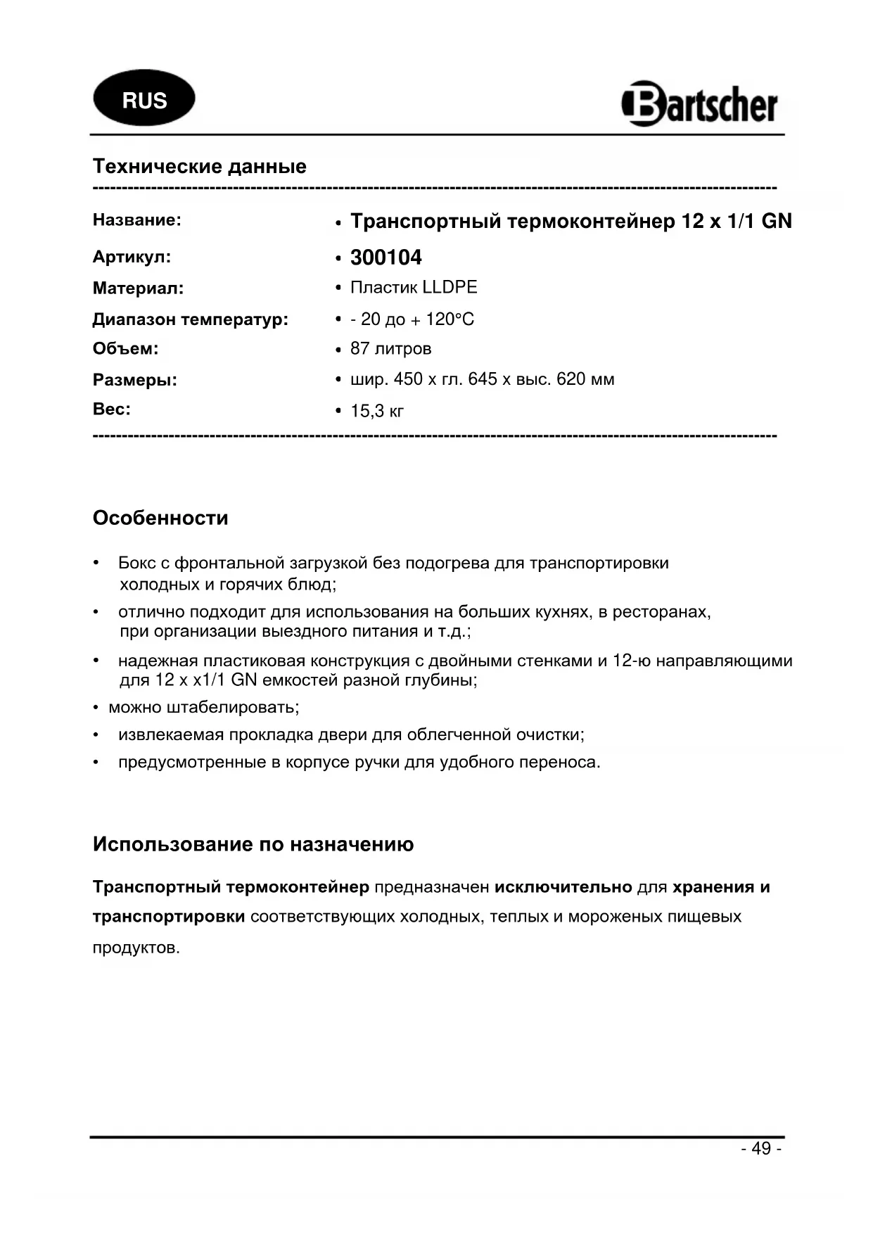 300104 - контейнер для еды BARTSCHER - Бесплатное руководство пользователя