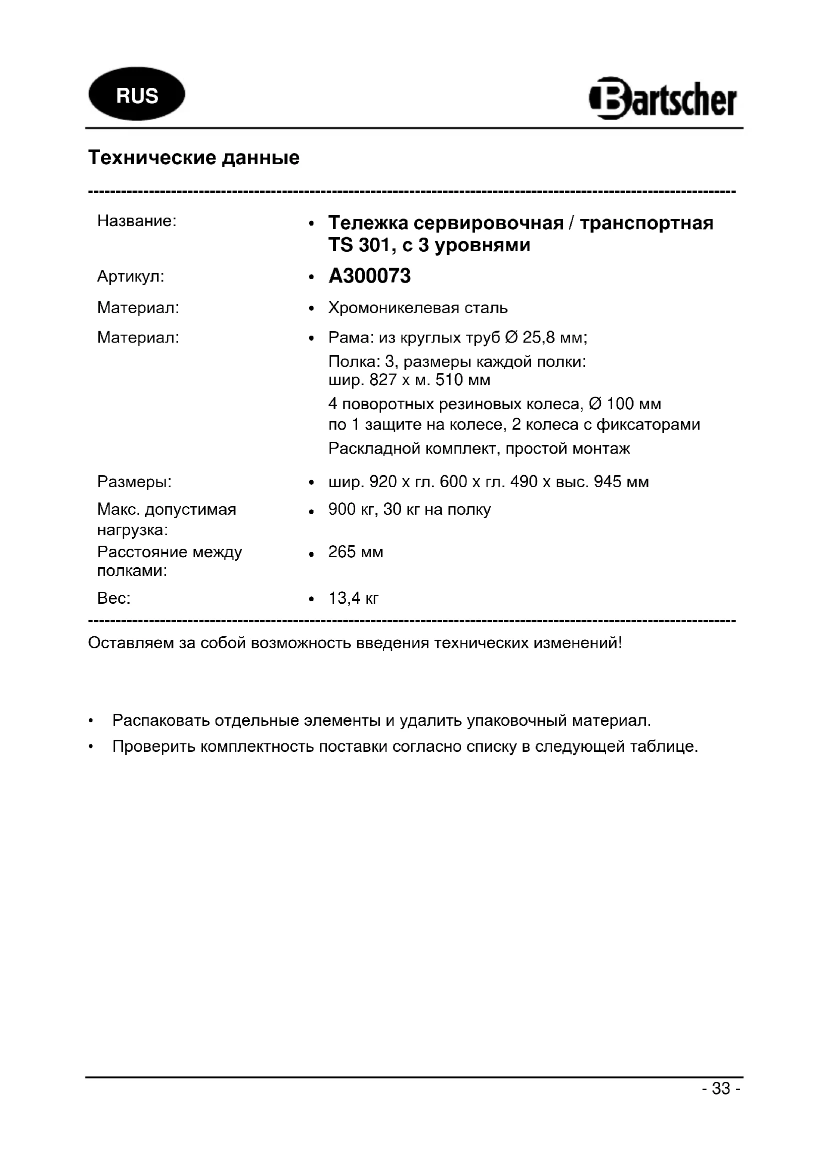 TS301 - Транспортная тележка BARTSCHER - Бесплатное руководство пользователя