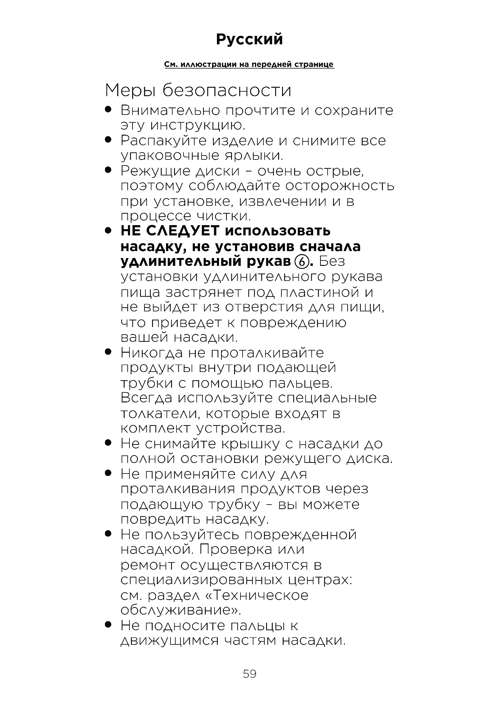 Никогда не проталкивайте продукты внутри подающей трубки с помощью пальцев. Всегда используйте специальные толкатели, которые входят в комплект устройства.