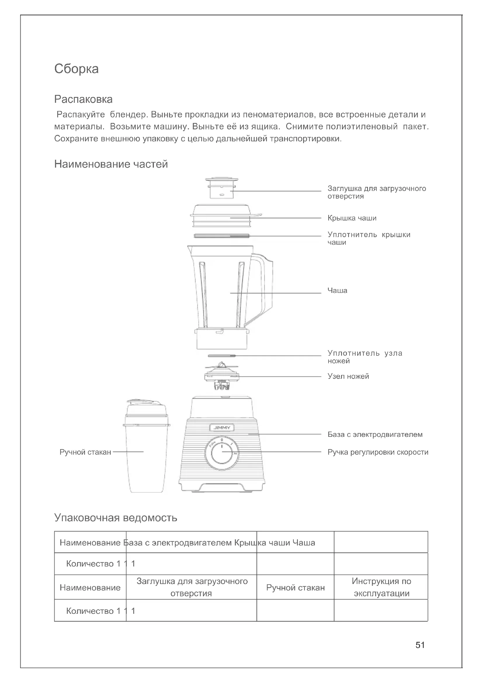 Распакуйте блендер. Выньте прокладки из пеноматериалов, все встроенные детали и материалы. Возьмите машину. Выньте её из ящика. Снимите полиэтиленовый пакет. Сохраните внешнюю упаковку с целью дальнейшей транспортировки. Наименование частей Наименование База с электродвигателем Крышка чаши Чаша Количество 1 1 1 Наименование Заглушка для загрузочного