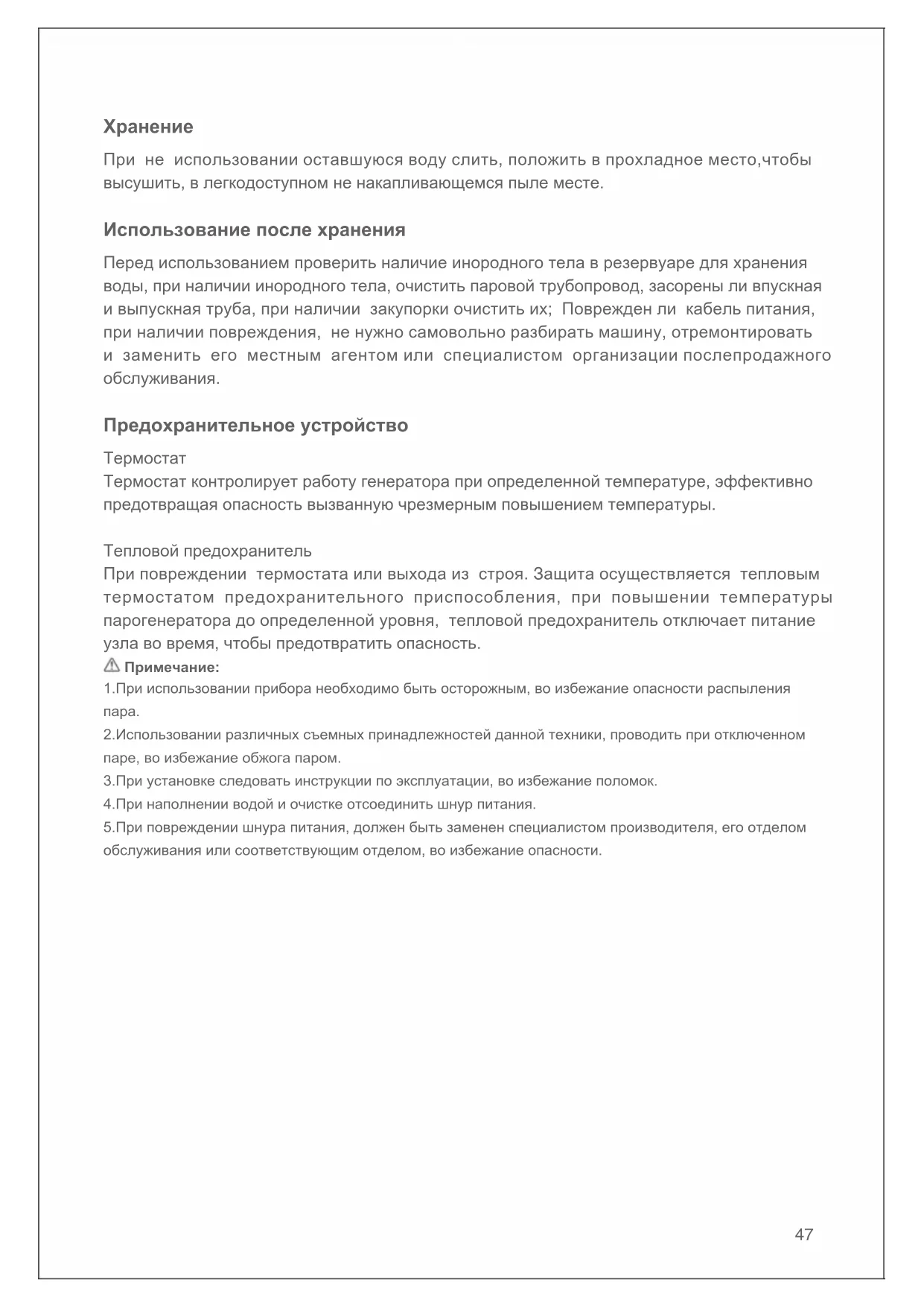 При не использовании оставшуюся воду слить, положить в прохладное место,чтобы высушить, в легкодоступном не накапливающемся пыле месте. Использование после хранения Перед использованием проверить наличие инородного тела в резервуаре для хранения воды, при наличии инородного тела, очистить паровой трубопровод, засорены ли впускная и выпускная труба, при наличии закупорки очистить их; Поврежден ли кабель питания, при наличии повреждения, не нужно самовольно разбирать машину, отремонтировать и заменить его местным агентом или специалистом организации послепродажного обслуживания. Предохранительное устройство