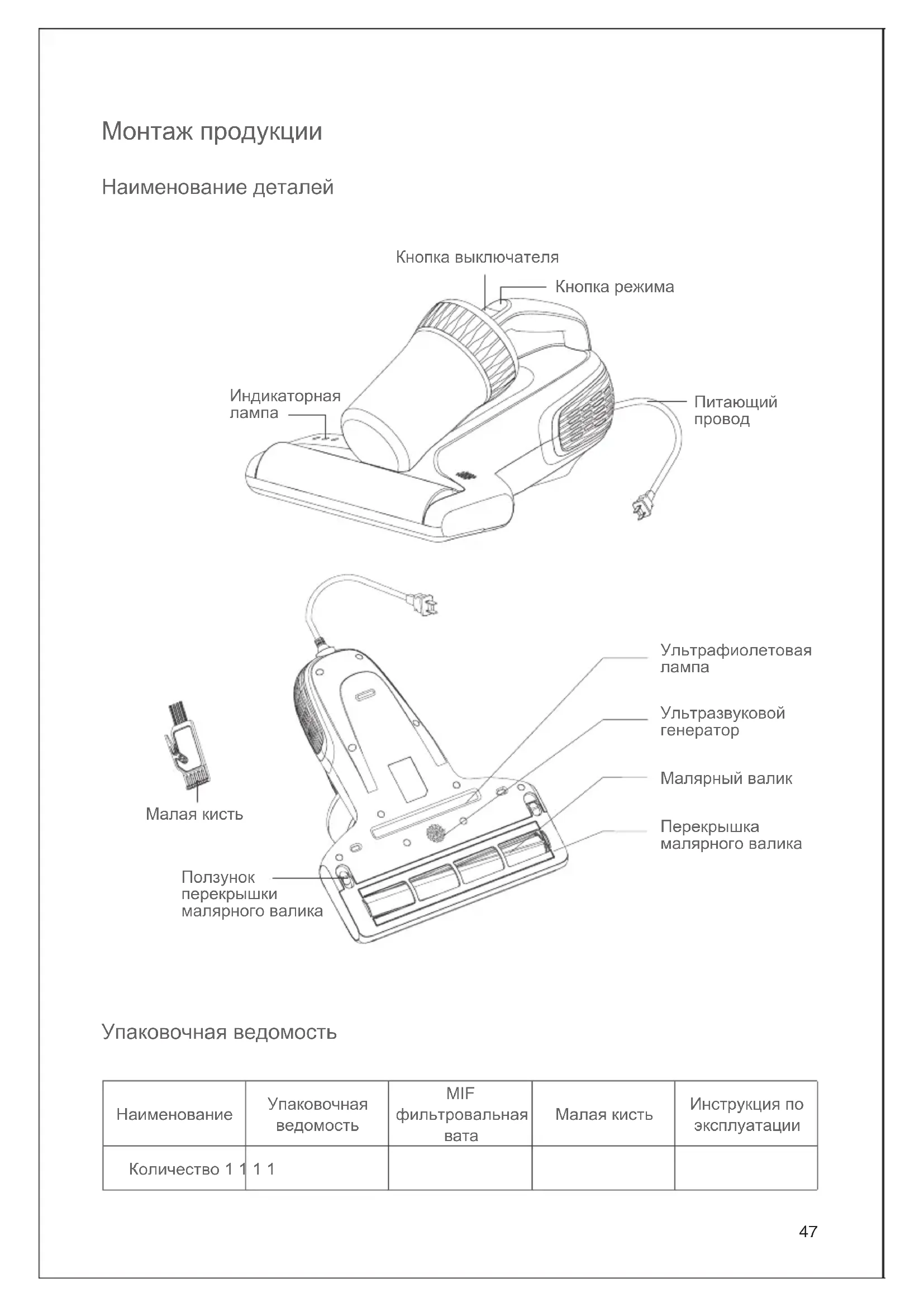 малярного валика48 Использование продукции Вставлять вилку в розетку, и после нажатия кнопки выключателя пылесос для удаления клещей по умолчанию включит режим удаления клещей + поглощения пыли выбиванием, соответствующая индикаторная лампа загорается; Нажимать кнопку режима, чтобы переключить режим поглощения пыли выбиванием, и соответствующая индикаторная лампа загорается,Еще раз нажимать кнопку режима, чтобы переключить режим удаления клещей и поглощения,Еще раз нажимать кнопку режима, чтобы переключиться обратно в режим удаления клещей + поглощения пыли выбиванием. Еще раз нажимать кнопку переключателя, и целая машина перестанет работать. Индикаторная лампа чистоты 1.Загорается зеленая лампа при запуске машины. 2.Когда вдыхается больше пыли, индикаторная лампа загорается красным, указывая на то, что клиентам необходимо главно очистить данную область. 3.Когда концентрация вдыхаемой пыли умеренная, индикаторная лампа загорается оранжевым, указывая на то, что клиенту все еще необходимо очистить данную область. 4.Когда вдыхается меньше пыли или отсутствует пыль, индикаторная лампа загорается зеленым, указывая на то, что клиенту не нужно главно очистить данную область. Примечание: Чтобы избегать несчастный случай, ультрафиолетовая лампа должна находиться в пределах примерно 3 см от облучаемого объекта, а наклон машины не должен превышать 30 градусов для нормальной работы. За пределами данного диапазона ультрафиолетовая лампа автоматически
