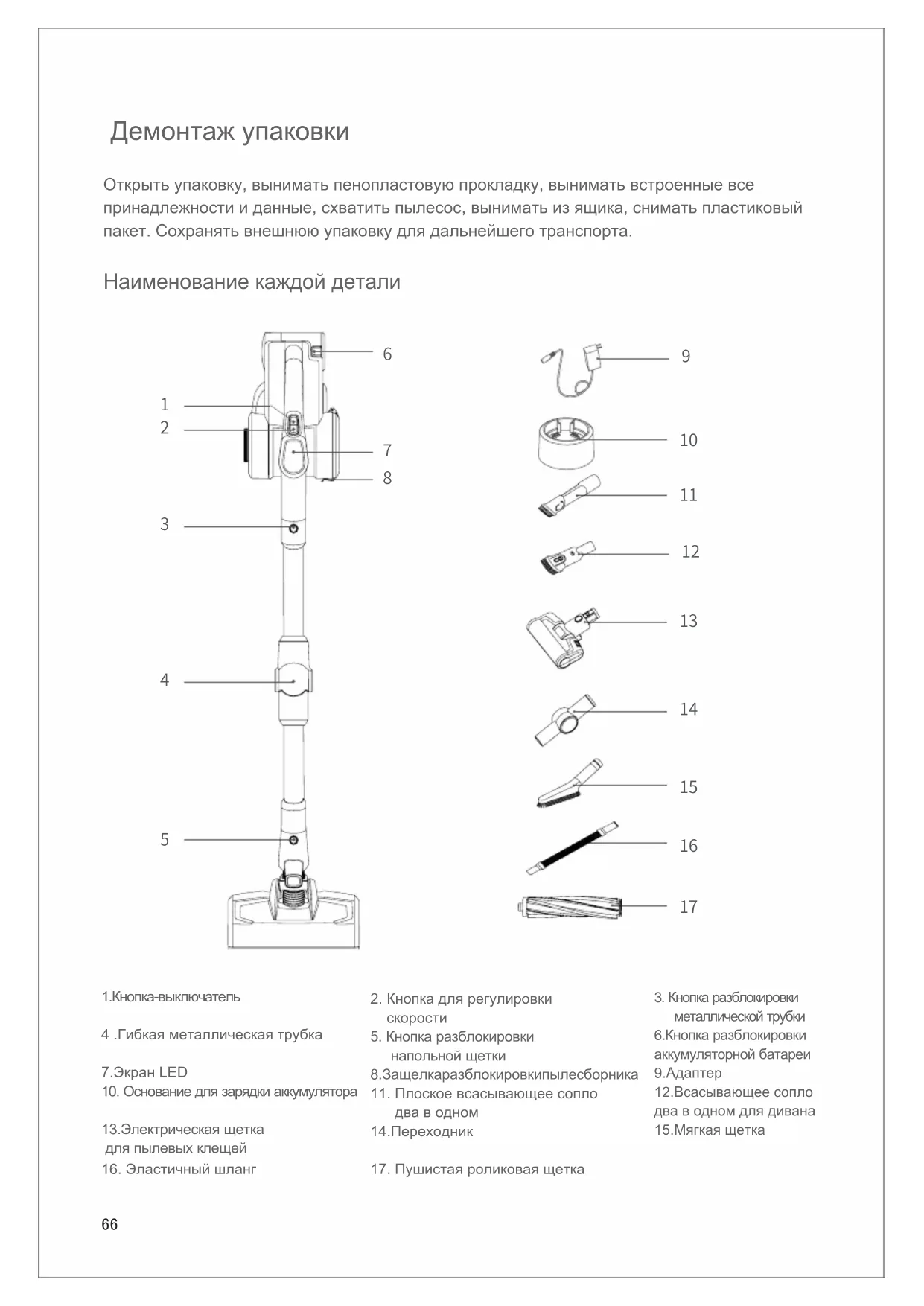 металлической трубки 6.Кнопка разблокировки аккумуляторной батареи 9.Адаптер 12.Всасывающее сопло два в одном для дивана 15.Мягкая щетка