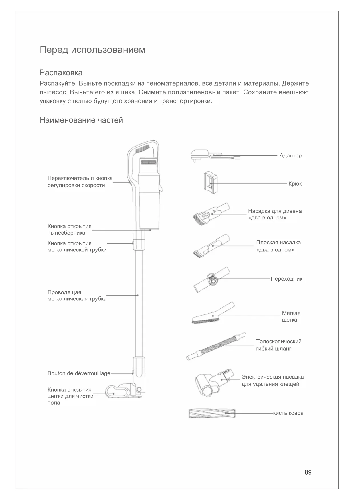 Распакуйте. Выньте прокладки из пеноматериалов, все детали и материалы. Держите пылесос. Выньте его из ящика. Снимите полиэтиленовый пакет. Сохраните внешнюю упаковку с целью будущего хранения и транспортировки. Наименование частей Кнопка открытия щетки для чистки