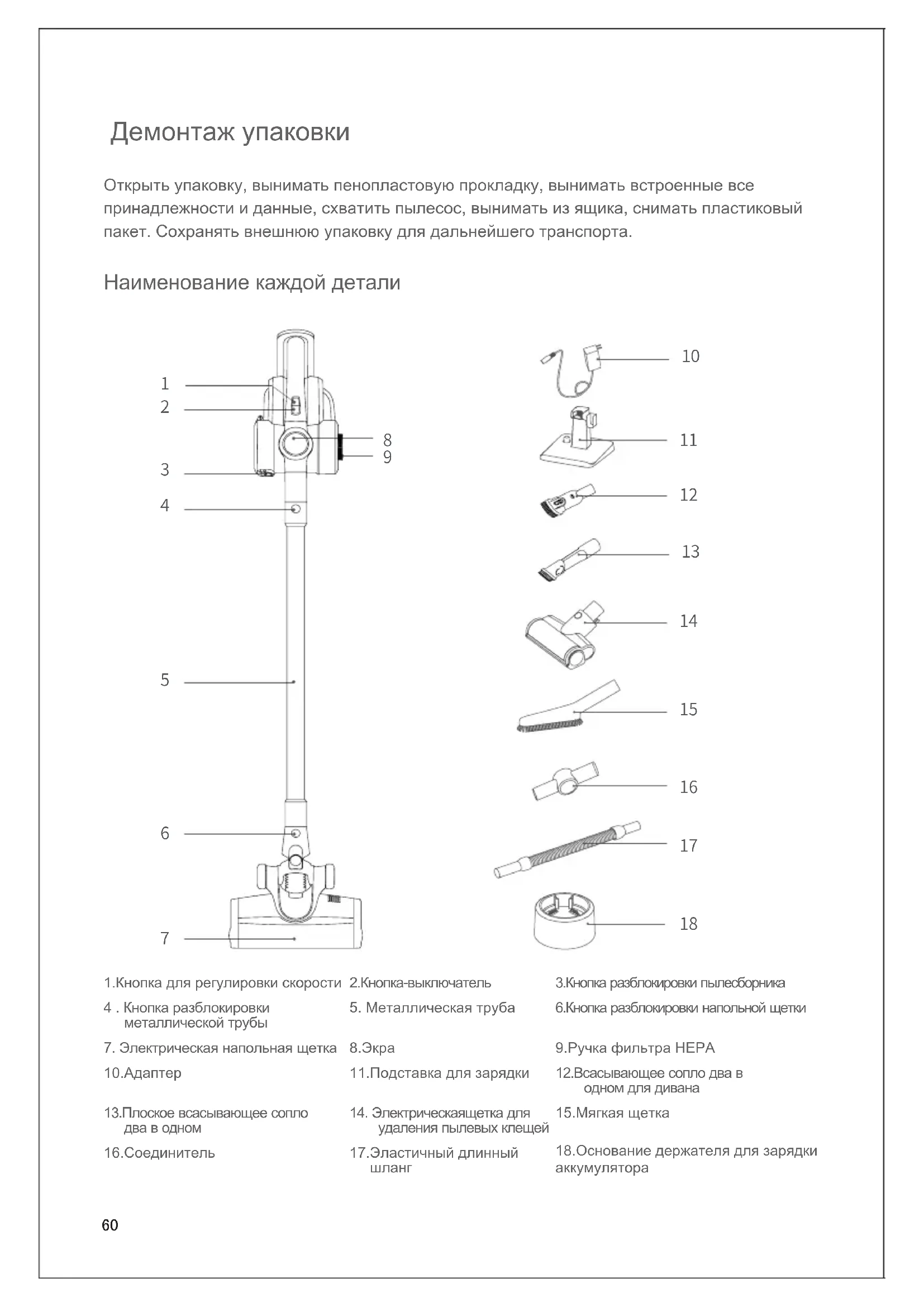 3.Кнопка разблокировки пылесборника 6.Кнопка разблокировки напольной щетки 9.Ручка фильтра HEPA 12.Всасывающее сопло два в одном для дивана 15.Мягкая щетка 18.Основание держателя для зарядки аккумулятора